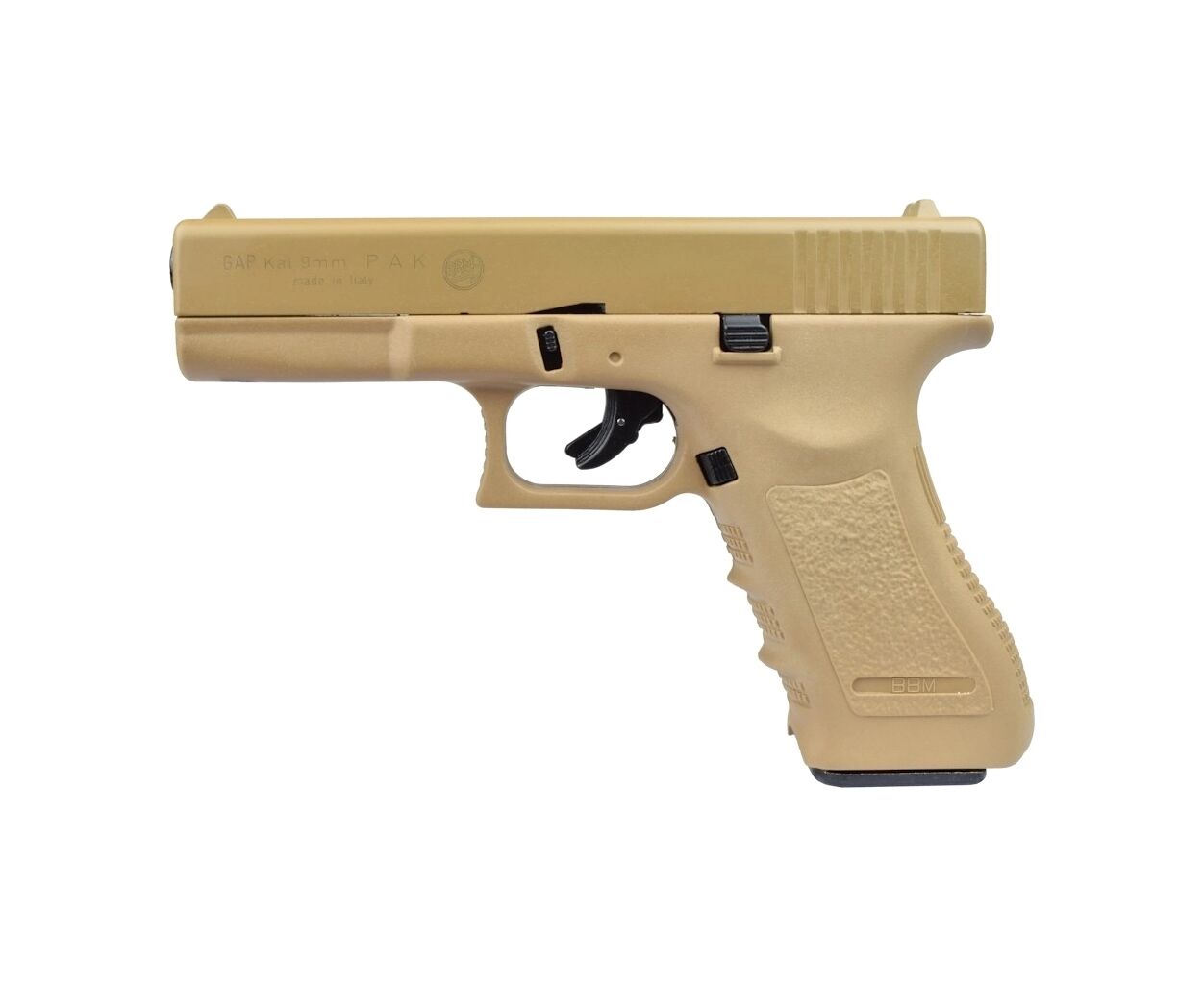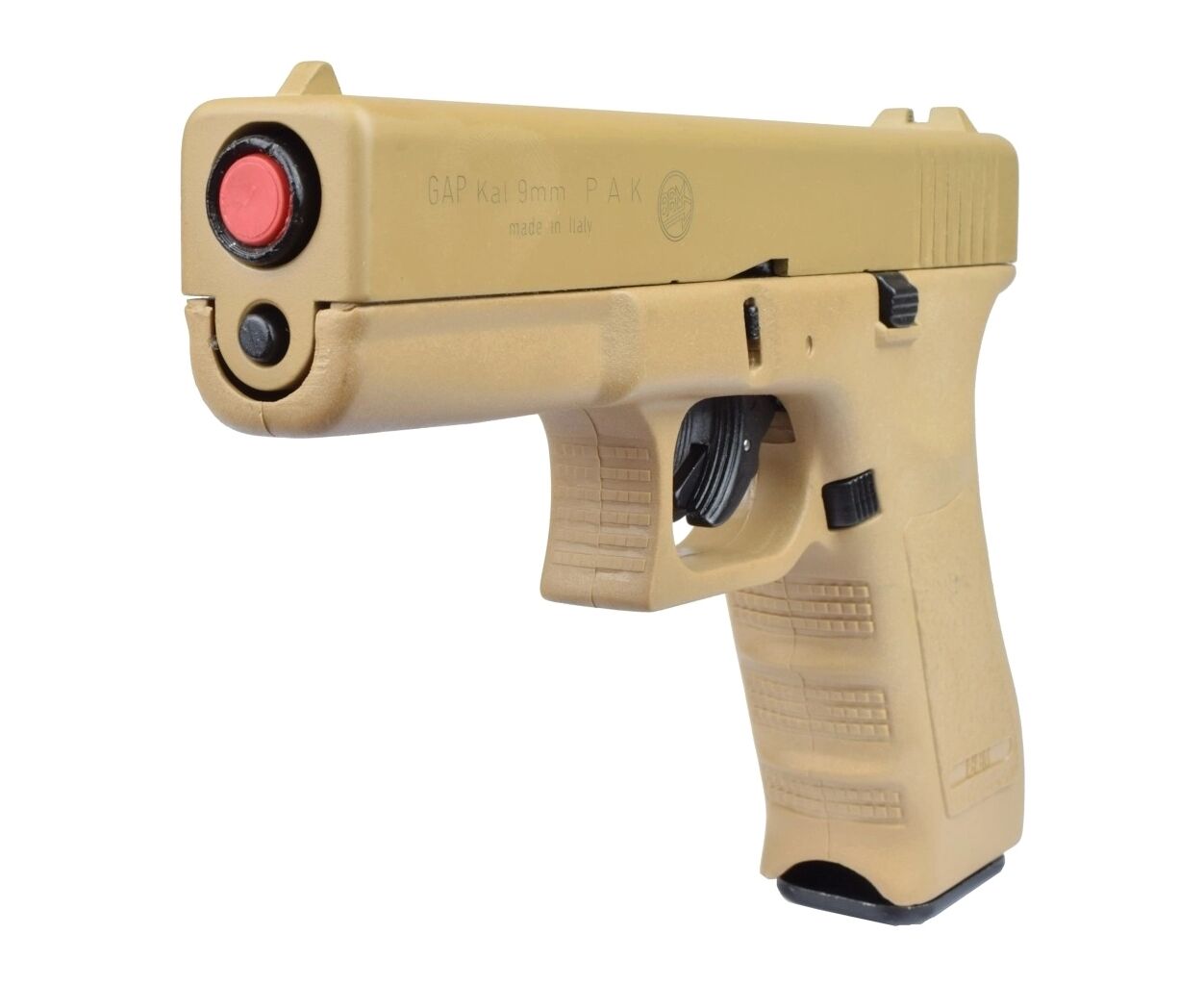 Сигнальный пистолет от компании Bruni GAP кал.9 РАК является копией знаменитого Glock 17. Данное приспособление предназначено для отстрела холостых патронов калибра 9мм РАК. Затвор выполнен из цинкового сплава, что имитирует вес пистолета приближенный к оригиналу. Рама выполнена из прочного полимерного материала. УСМ по способу взвода, одинарного действия (Single Action) - нажатие на спусковой крючок не взводит курок, а просто совершает выстрел, взвод курка происходит за счёт движения затвора. Также пистолет оборудован фирменым предохранителем на спусковом крючке, свойственый Glock.