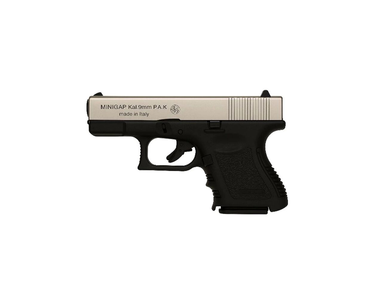 Сигнальный пистолет от компании Bruni Mini GAP кал.9 РАК является копией австрийского Glock 26. Данное приспособление предназначено для отстрела холостых патронов калибра 9мм РАК. Затвор выполнен из цинкового сплава, что имитирует вес пистолета приближенный к оригиналу. Рама выполнена из прочного полимерного материала. УСМ по способу взвода, одинарного действия (Single Action) - нажатие на спусковой крючок не взводит курок, а просто совершает выстрел, взвод курка происходит за счёт движения затвора. Также пистолет оборудован фирменым предохранителем на спусковом крючке, свойственый Glock.
