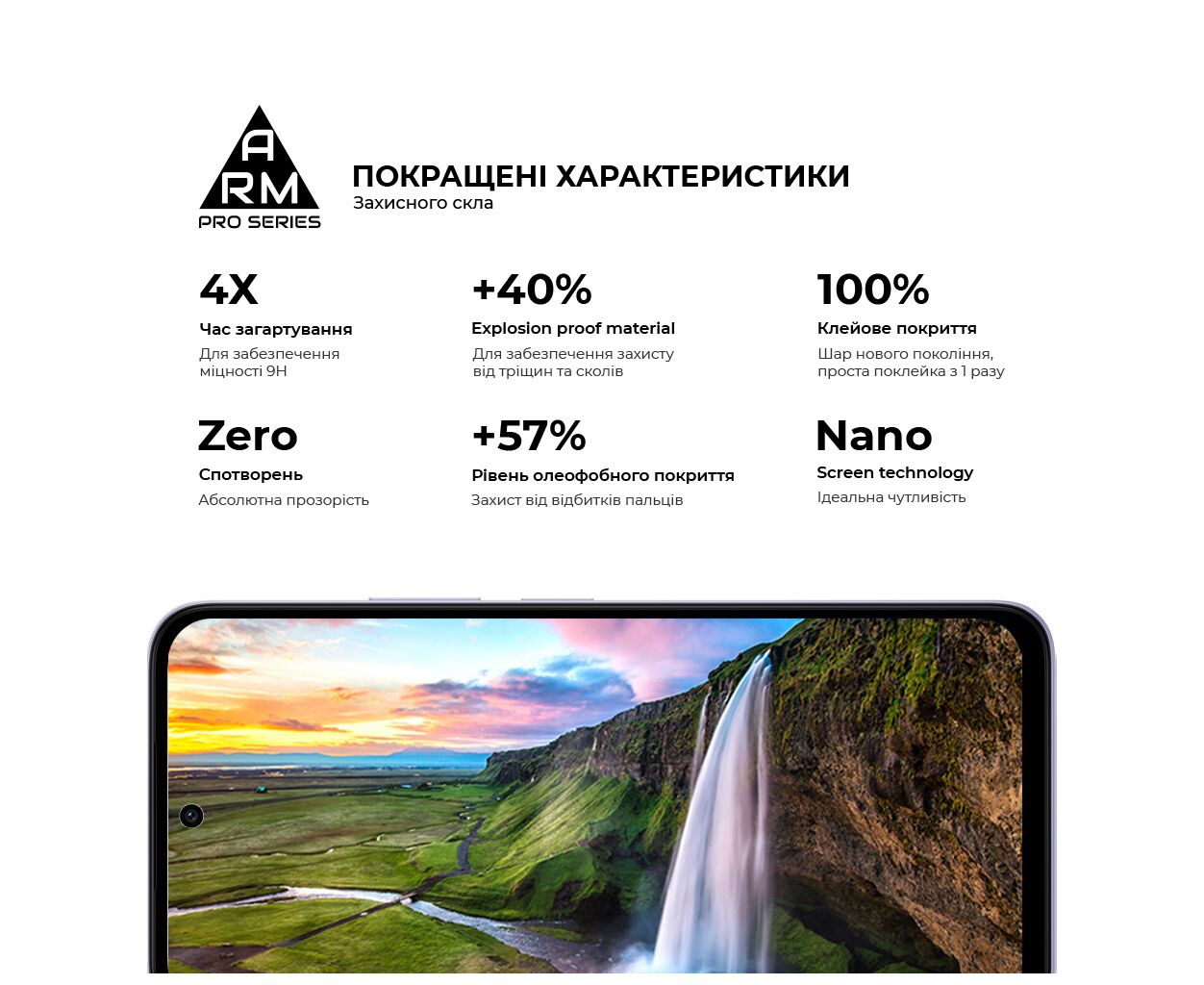 Захисне скло Armorstandart Pro Series має оптимальні габарити та товщину на 0,3 мм. Передбачено вирізи під усі датчики, камери та роз'єми.