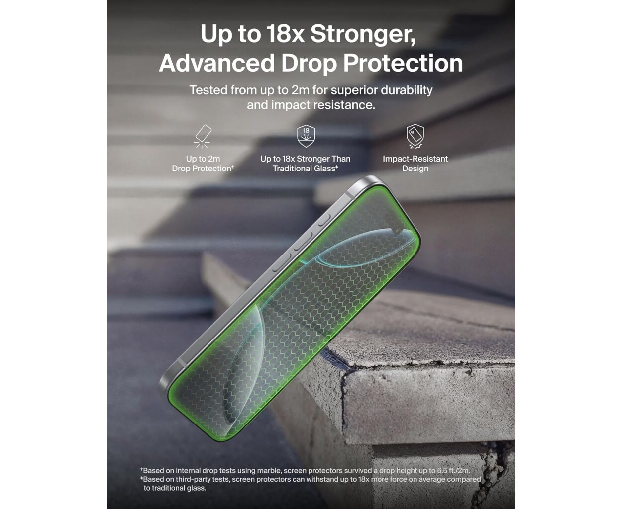 Совместимость с моделями - Apple iPhone 17 Pro, Особенности - в 18 раз прочнее, чем обычное стекло, полноэкранный эффект приватности, антимикробная обработка, покрытие, отталкивающее отпечатки пальцев, изготовлено из 60% переработанного стекла