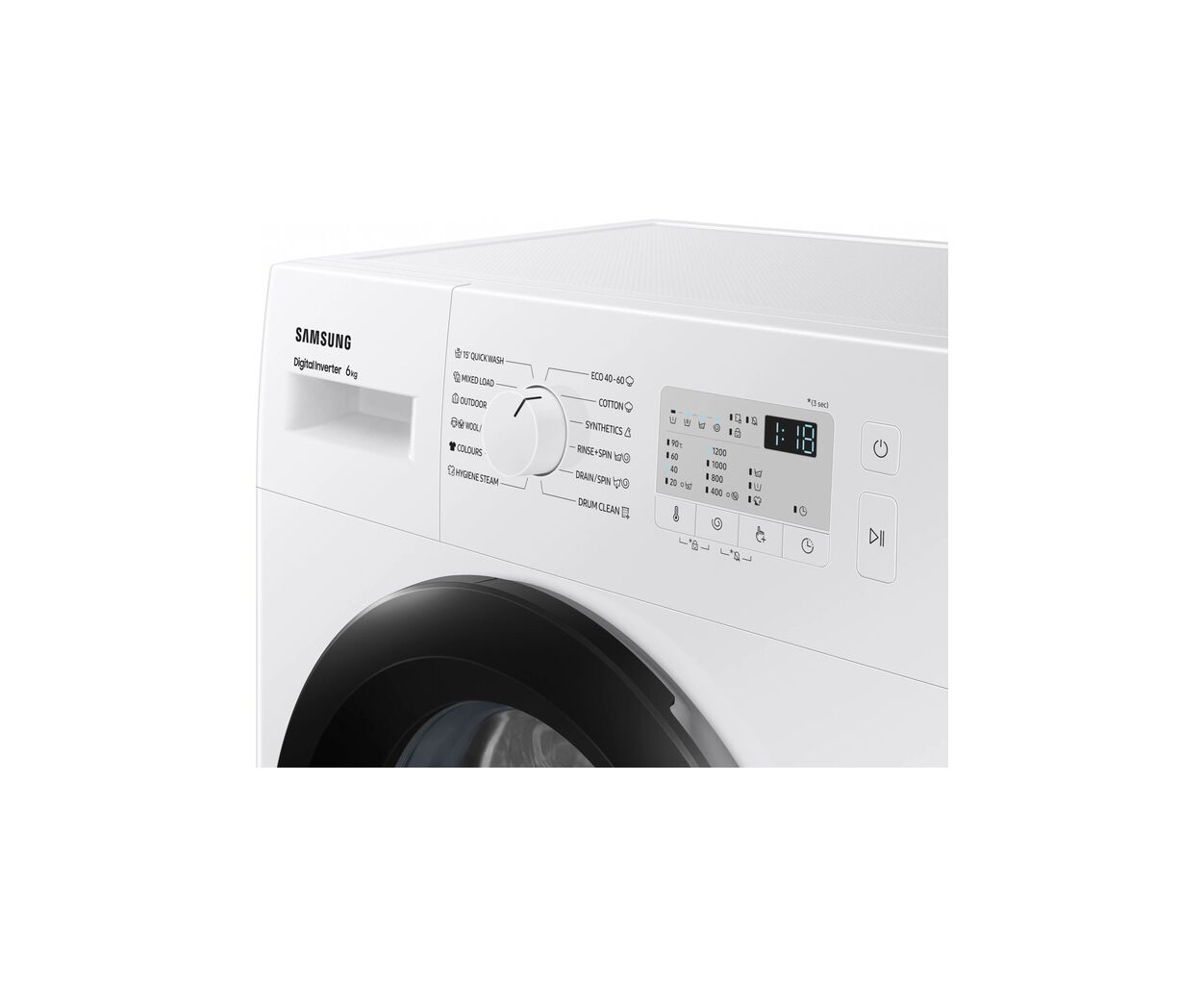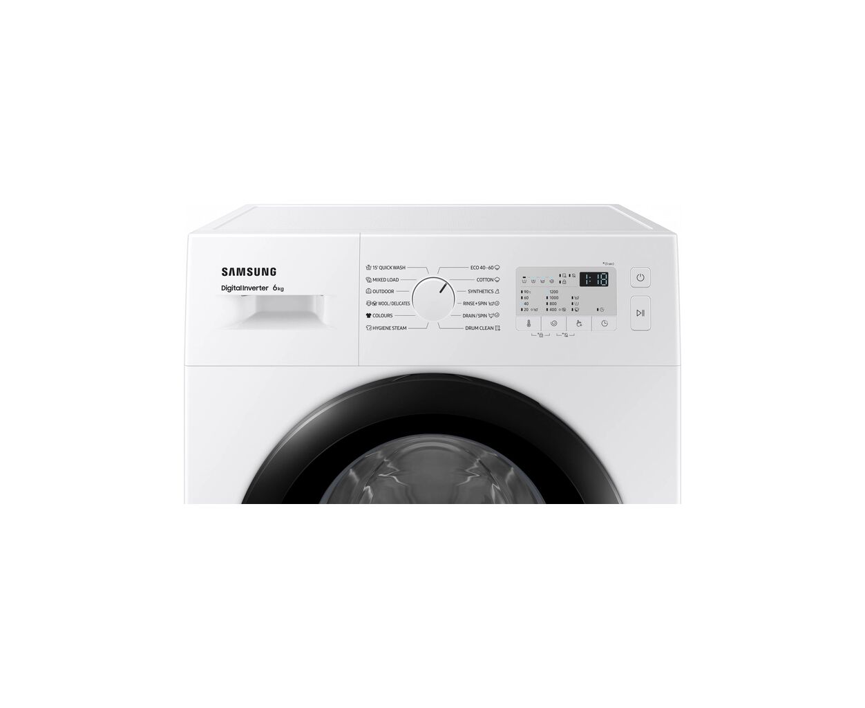 тип - автомат, инверторный, отдельностоящий, фронтальная загрузка, Максимальная загрузка белья - 6 кг, Максимальная скорость отжима - 1200 об/мин, количество программ - 12, есть, возможность дозагрузки белья, обработка паром, замок от детей, Цвет корпуса - белый