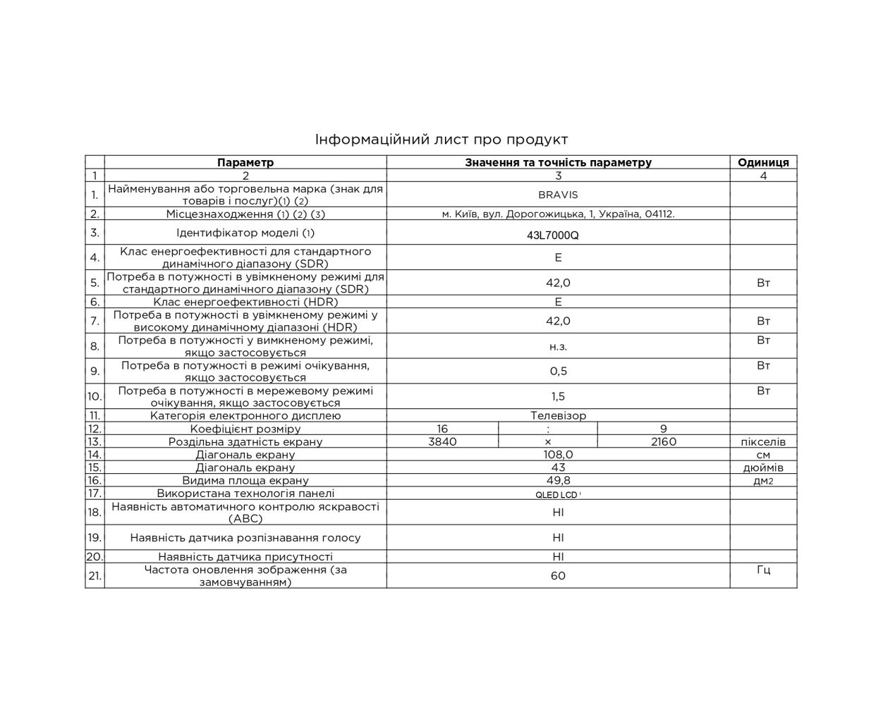 Характеристики Телевизор Bravis 43L7000Q