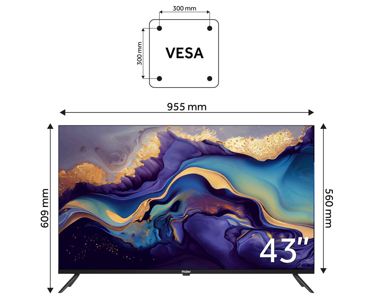 Стильный и современный дизайн телевизора Haier H43K801FG отлично подходит к любому интерьеру. Для более удобного размещения телевизор предусмотрено оборудовать VESA-креплением (300x300 мм), которое позволяет легко устанавливать его на стену, освобождая пространство в комнате.