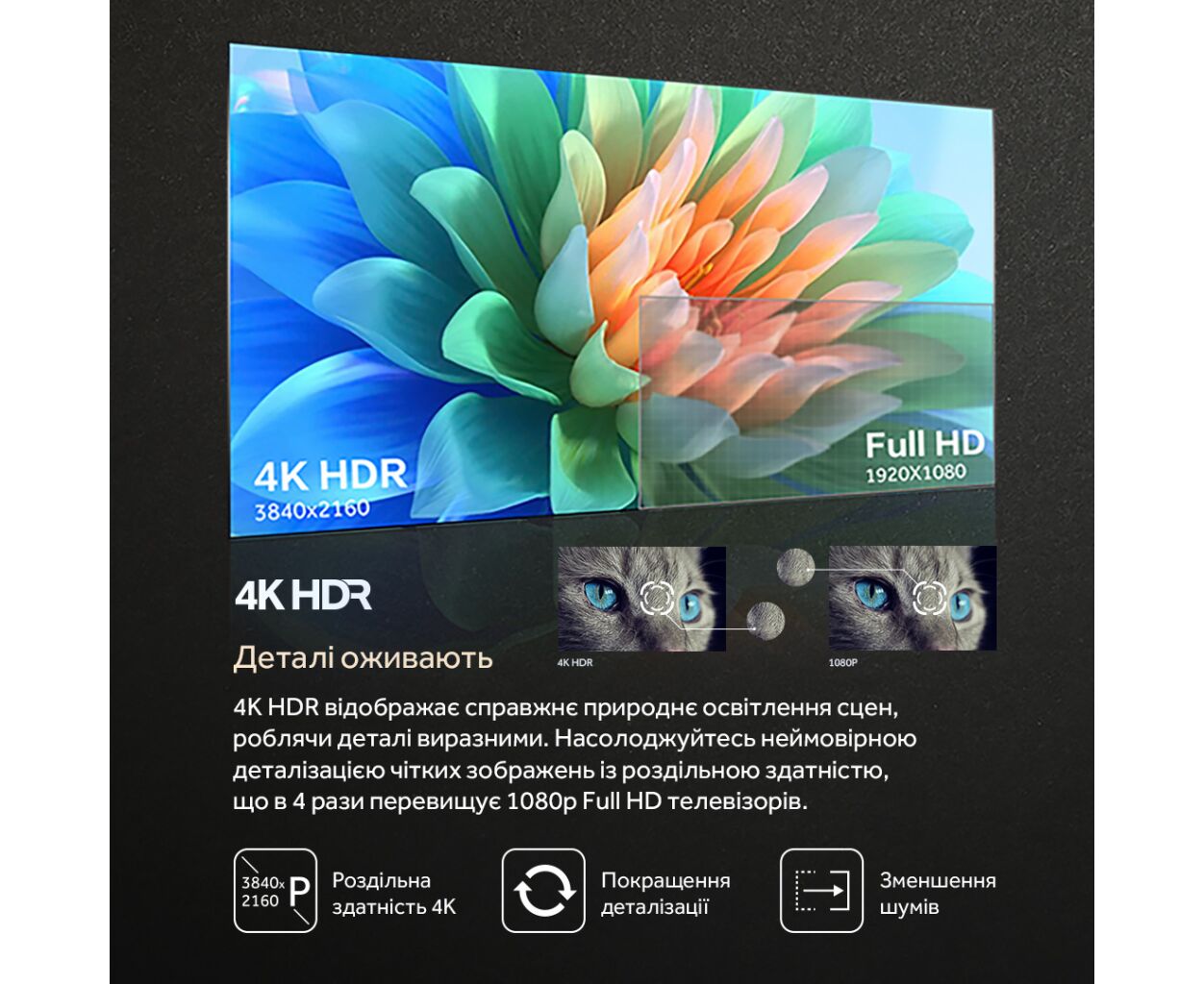 Direct LED подсветка в сочетании с технологией HDR придают изображениям насыщенность и высокую контрастность, оживляя каждую деталь на экране. Телевизор также обеспечивает широкие углы обзора 178°, предлагая исключительное качество изображения с любой точки комнаты, что идеально подходит для семейного просмотра.