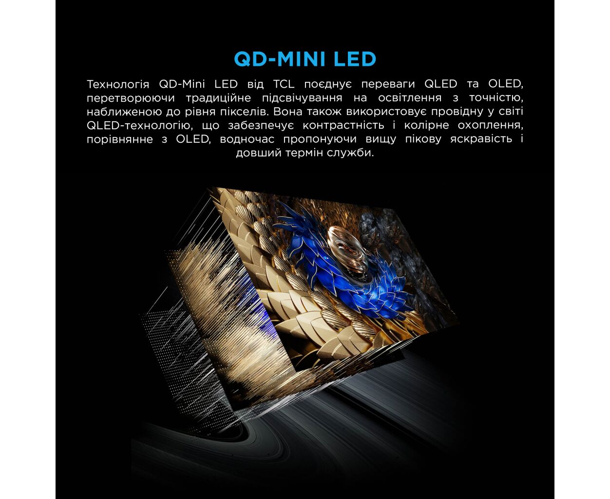 QD-Mini LED от TCL сочетает в себе преимущества технологий QLED и OLED, превращая традиционную подсветку в освещение, близкое к точности на уровне пикселей. В ней также используется ведущая в мире технология QLED, обеспечивающая контрастность и цветовую гамму, сравнимую с OLED, а также более высокую пиковую яркость и длительный срок службы. Это технология будущего для больших дисплеев.