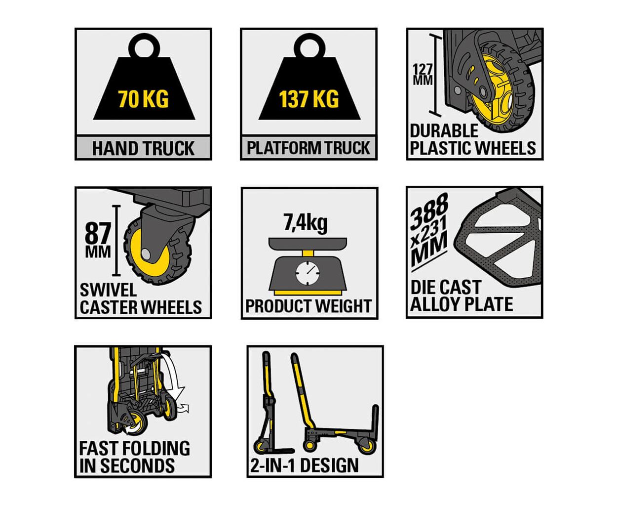 Характеристики Тележка грузовая Stanley раскладная, до 70/137кг, материал сталь, вес 7,4кг (SXWT-FT585)