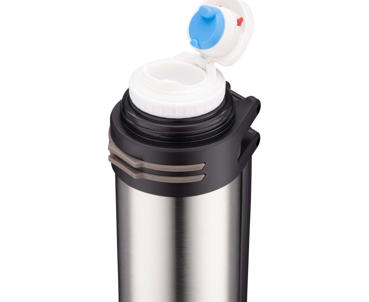 Ещё одной особенной функцией термоса является двойная система открытия. Он оснащён как поворотным механизмом, так и кнопкой-клапаном для лёгкого доступа к напитку в зависимости от ситуации. Эта универсальность делает термос простым в использовании даже в сложных условиях.