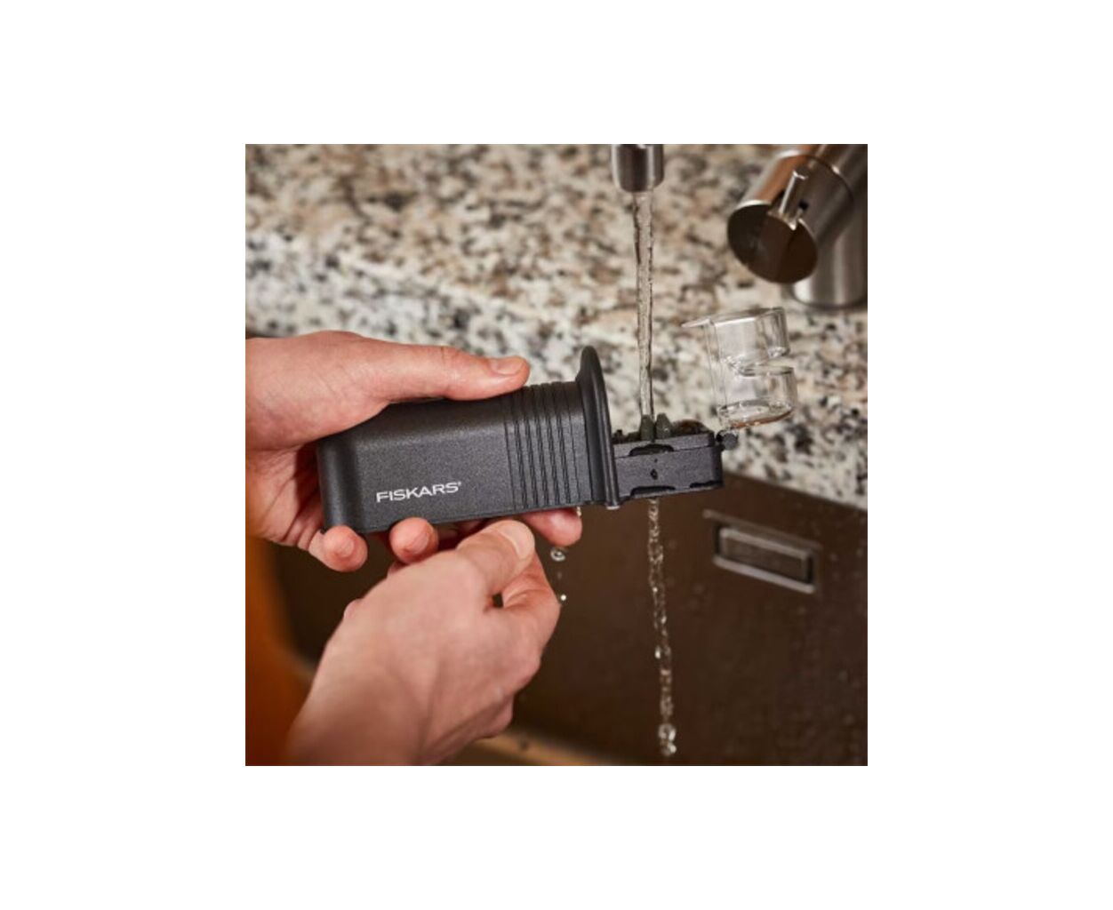 Простая в использовании точилка с керамическими камнями и нескользящим корпусом Fiskars Essential отлично подходит как для правой, так и для левой руки. Точило обеспечивает оптимальную режущую кромку. Просто положите точилку на ровную поверхность, поместите нож в паз и совершите несколько движений вперед и назад, мягко нажимая при этом. Легко чистится. Можно мыть в посудомоечной машине.