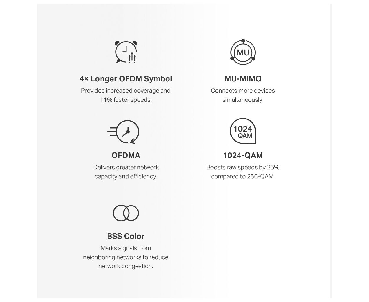 стандарты сетей - n, ac, ax, a, b, g, рабочая частота - 2.4 / 5 ГГц, интерфейсы - LAN 10/100/1000 Мбит/с, WAN 10/100/1000 Мбит/с