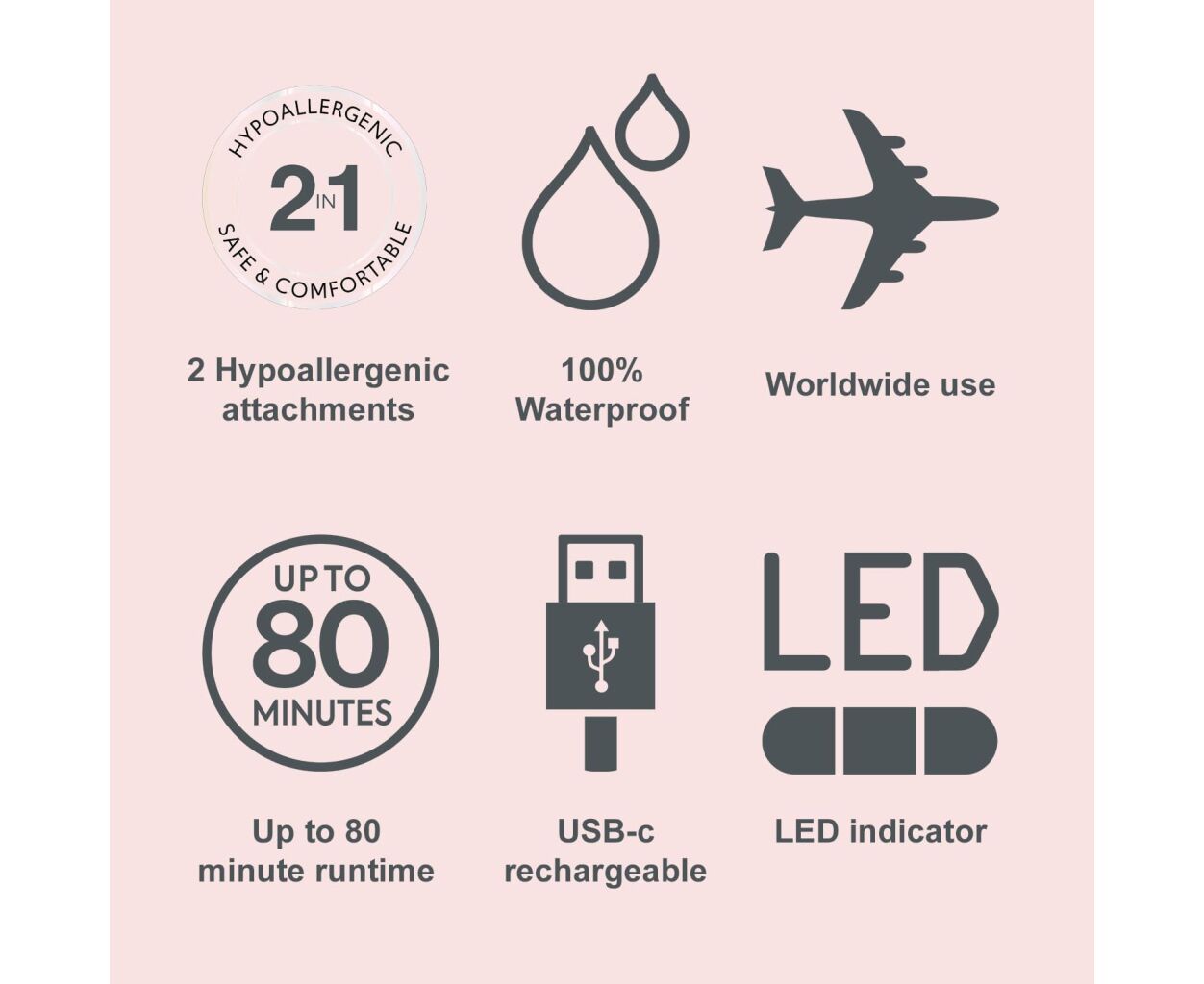 Результат? Гладкая кожа без раздражения, идеально подчеркнутые брови и ни одного лишнего волоска. Триммер на 100% водонепроницаем, поэтому его легко очищать под струей воды. Полная зарядка через USB-C занимает всего 90 минут, после чего можно использовать устройство до 80 минут без дополнительной подзарядки. Уникальная крышка со встроенным отсеком позволяет сохранять аксессуары компактно и удобно.