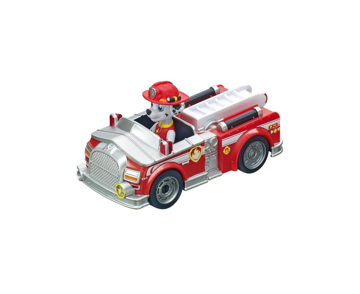 В ігровому наборі Carrera Автотрек First Paw Patrol На трасі далматин Маршалл зі своєю пожежною машиною та спортивна вівчарка Гонщик зі своєю поліцейською машиною змагаються один з одним.