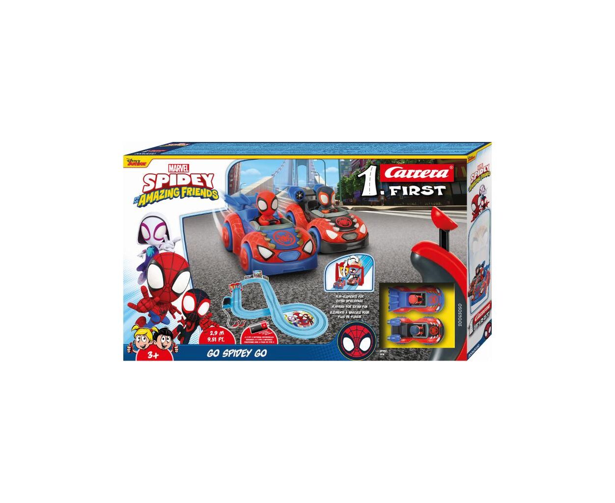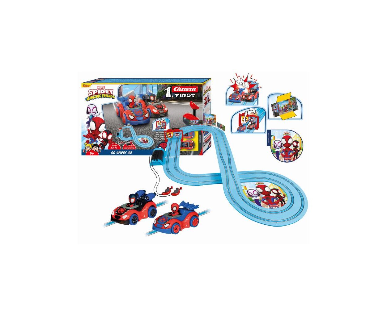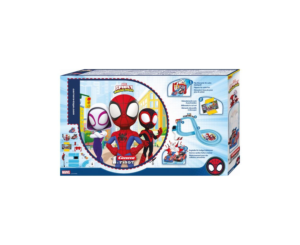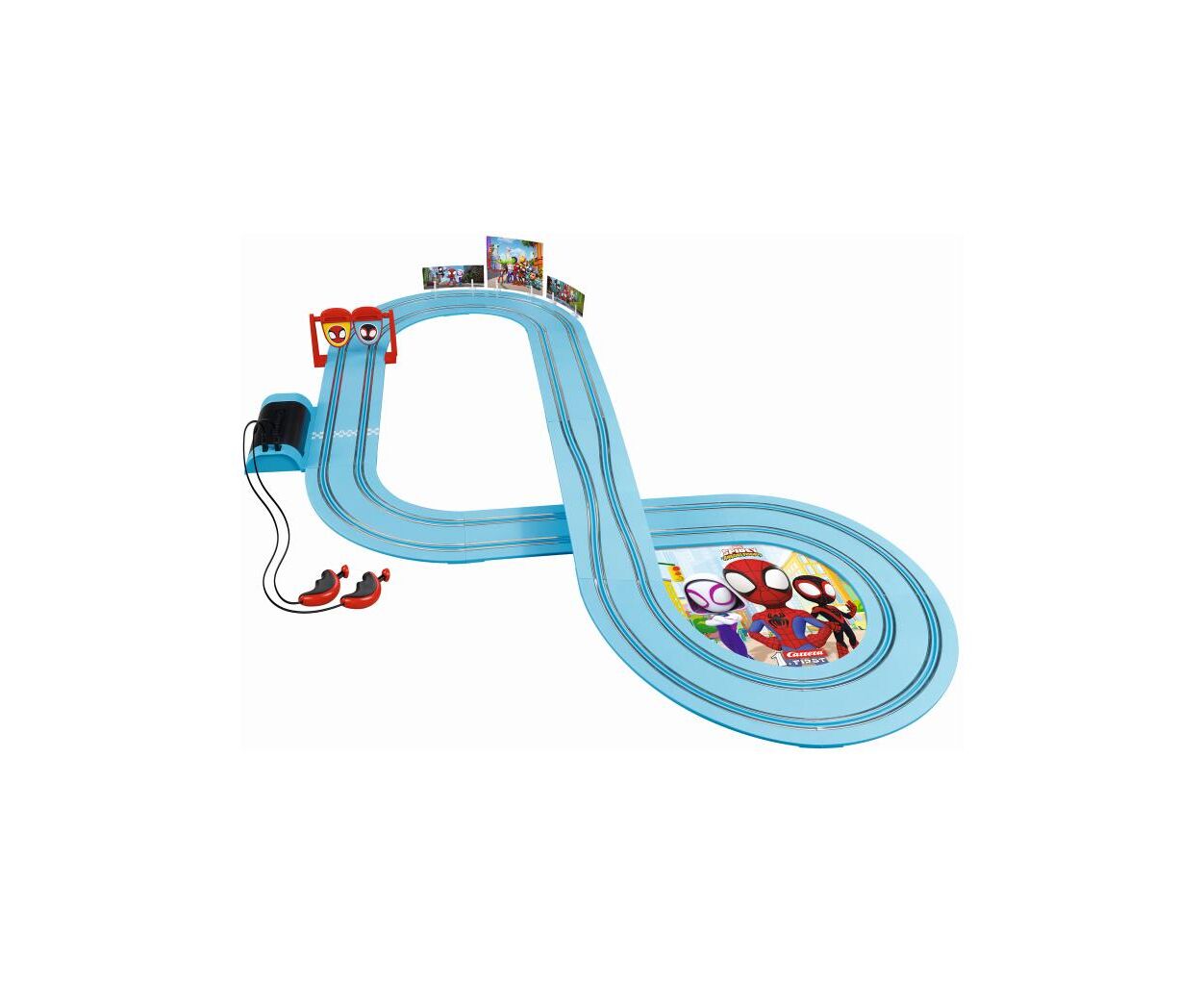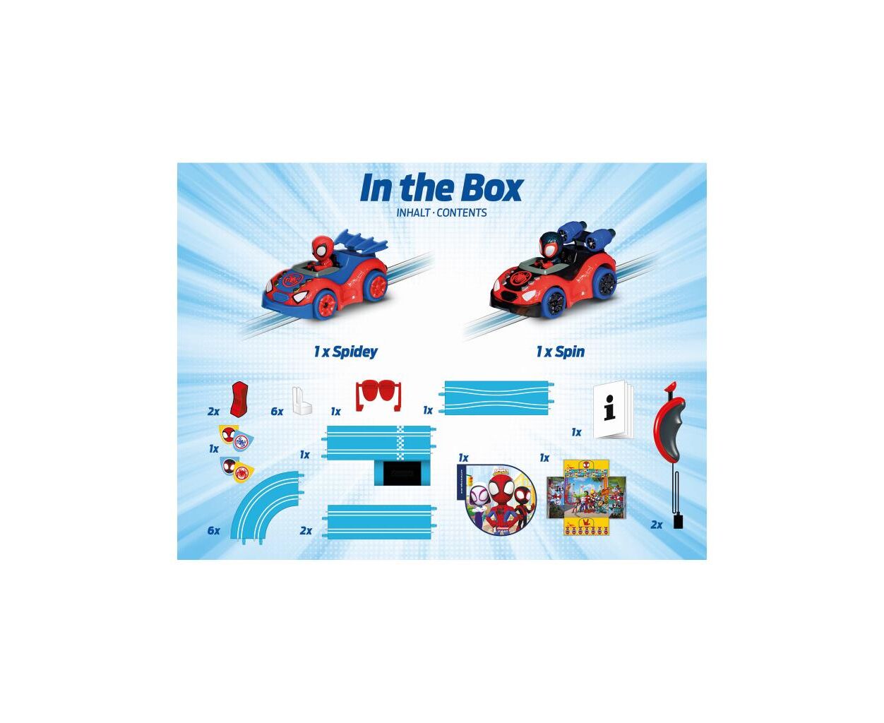Пітер Паркер приєднується до свого друга Майлза Моралеса - або Спін - із серії «Павук та його супердрузі» і по-справжньому натискає на газ на 2.9-метровій трасі. Гоночна траса Carrera FIRST пропонує юним гонщикам серйозні випробування – включаючи швидкісні прямі, повороти, вузькі ділянки – та море задоволення! Перекидні елементи мають привабливі емблеми Павука на яскраво-синій трасі. Гру збагачують декоративні елементи із мотивами із серії.