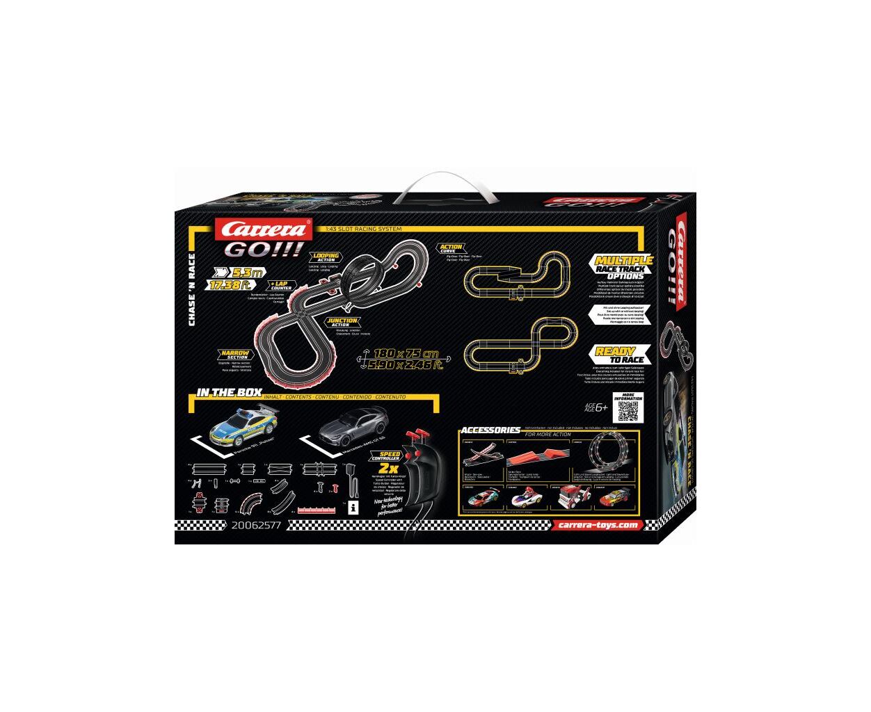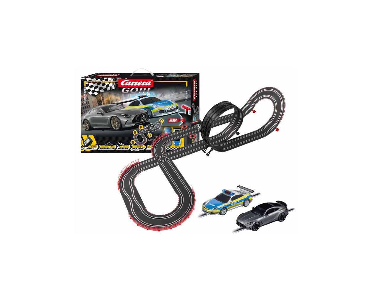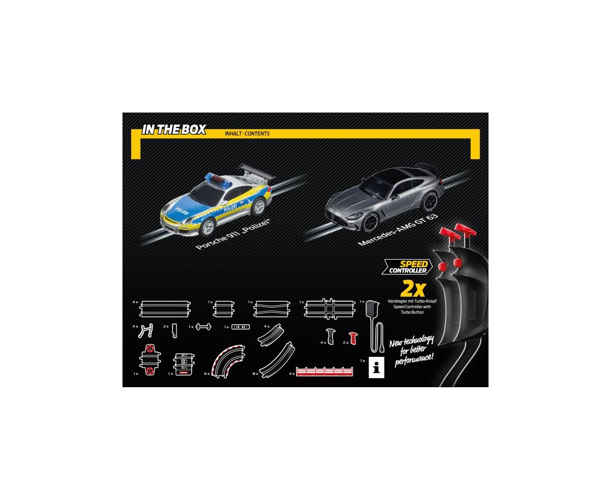 Дія відбувається на трасі Carrera GO! Переслідування та гонка, де поліцейський Porsche 911 переслідує AMG Mercedes GT на 5.3-метровій трасі. Надзвичайно вражаюча траса ставить перед юними водіями низку викликів – перехрестя, естакади, петлі, вузькі ділянки та швидкісні прямі, на яких захоплює дух.