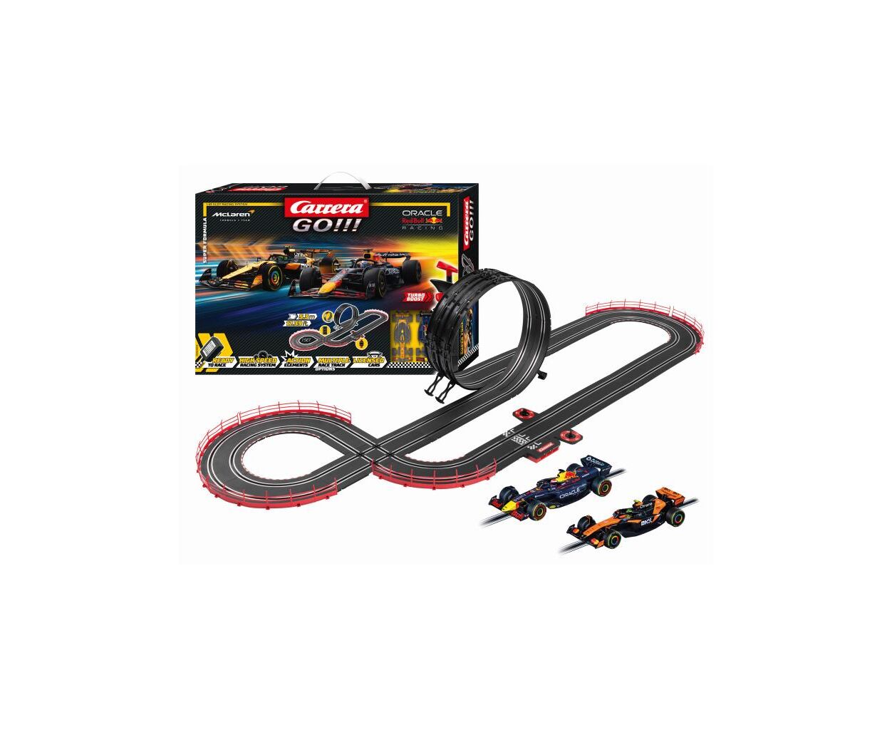 Макс Ферстаппен на боліді Oracle Red Bull Racing RB21 Ферстаппен, №1» та Ландо Норріс на боліді McLaren MCL39 «Л. Норріс, №4» беруть участь у захоплюючих дуелях. На трасі завдовжки 5.3 метри зі швидкісними прямими, вражаючими поворотами та петлею юні гонщики самі почуваються частиною світу Формули-1. Деталізовані боліди забезпечують справжню гоночну лихоманку, а напружені дуелі та захоплюючі обгони викликають вибух адреналіну.