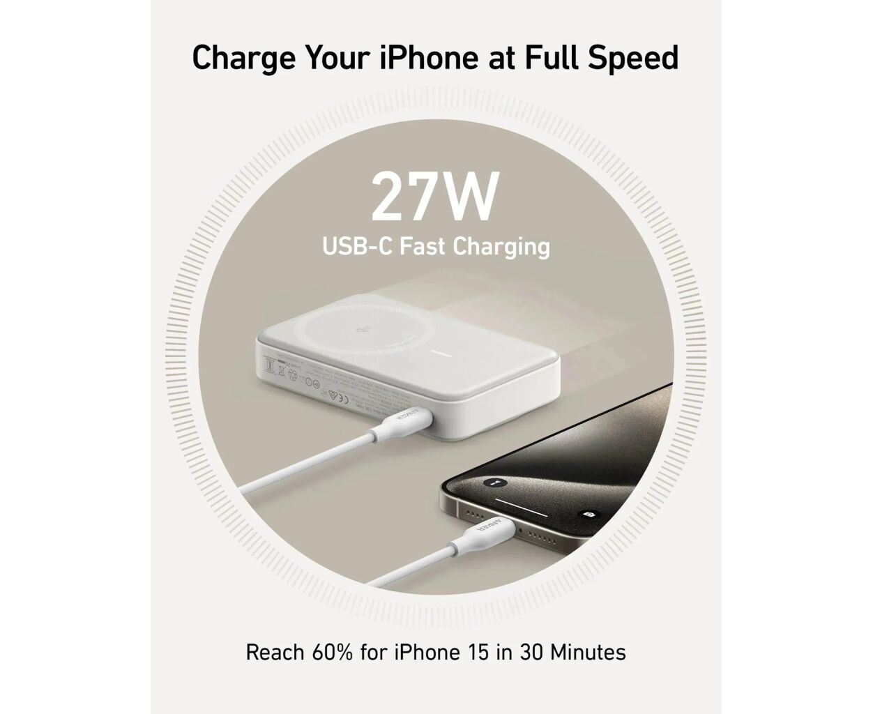 Порт USB-C потужністю 27 Вт дозволяє зарядити iPhone 15 до 60% за 30 хвилин та оперативно відновити заряд самого павербанка.
