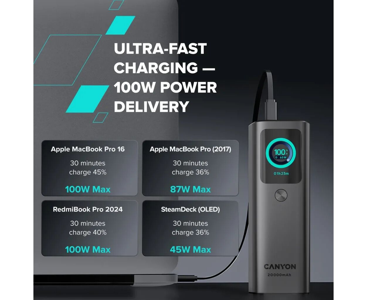 Опис Батарея універсальна Canyon 20000mAh OnPower 265 PD/100W (CNS-CPB265DG)