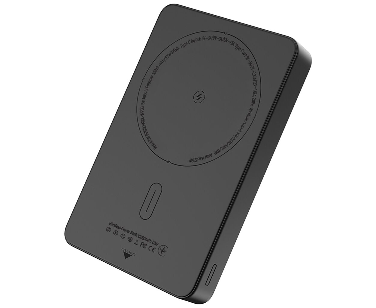 Ємність - 10000 mAh, електрохімічна система - Li-pol, Джерело заряду батареї - мережа 220 В, інтерфейси підключення (вихід) - USB Type-C, Wireless Charger, вихідний струм - 3 A, 2.22 A, 1.67 A, матеріал корпусу - алюміній, ABS пластик, Колір - чорний