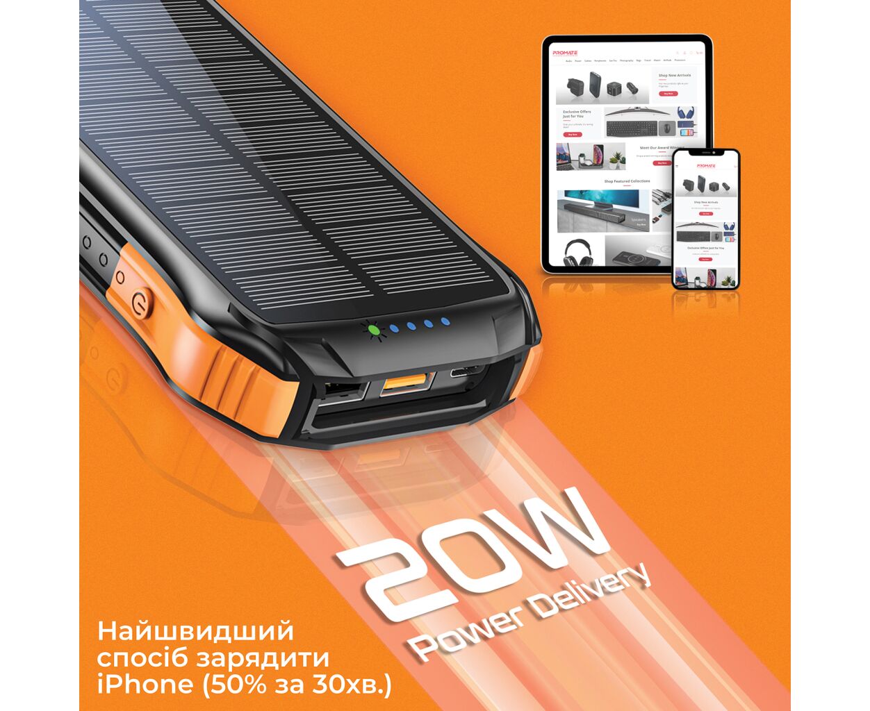Опис Батарея універсальна Promate 10000mAh PD/20W, QC/3/0, Solar, QI, IP65 (solartank-10pdqi.black)