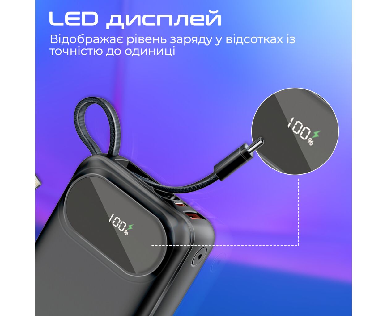 Ємність - 20000 mAh, електрохімічна система - Li-pol, Джерело заряду батареї - USB, інтерфейси підключення (вихід) - USB Type-C, Lightning, USB, вихідний струм - 3 A, 2.23 A, 2.25 A, 1.75 A, 2.95 A, розмір - 100 х 70 х 30 мм, матеріал корпусу - вогнетривкий пластик, вага - 327 г, Колір - чорний