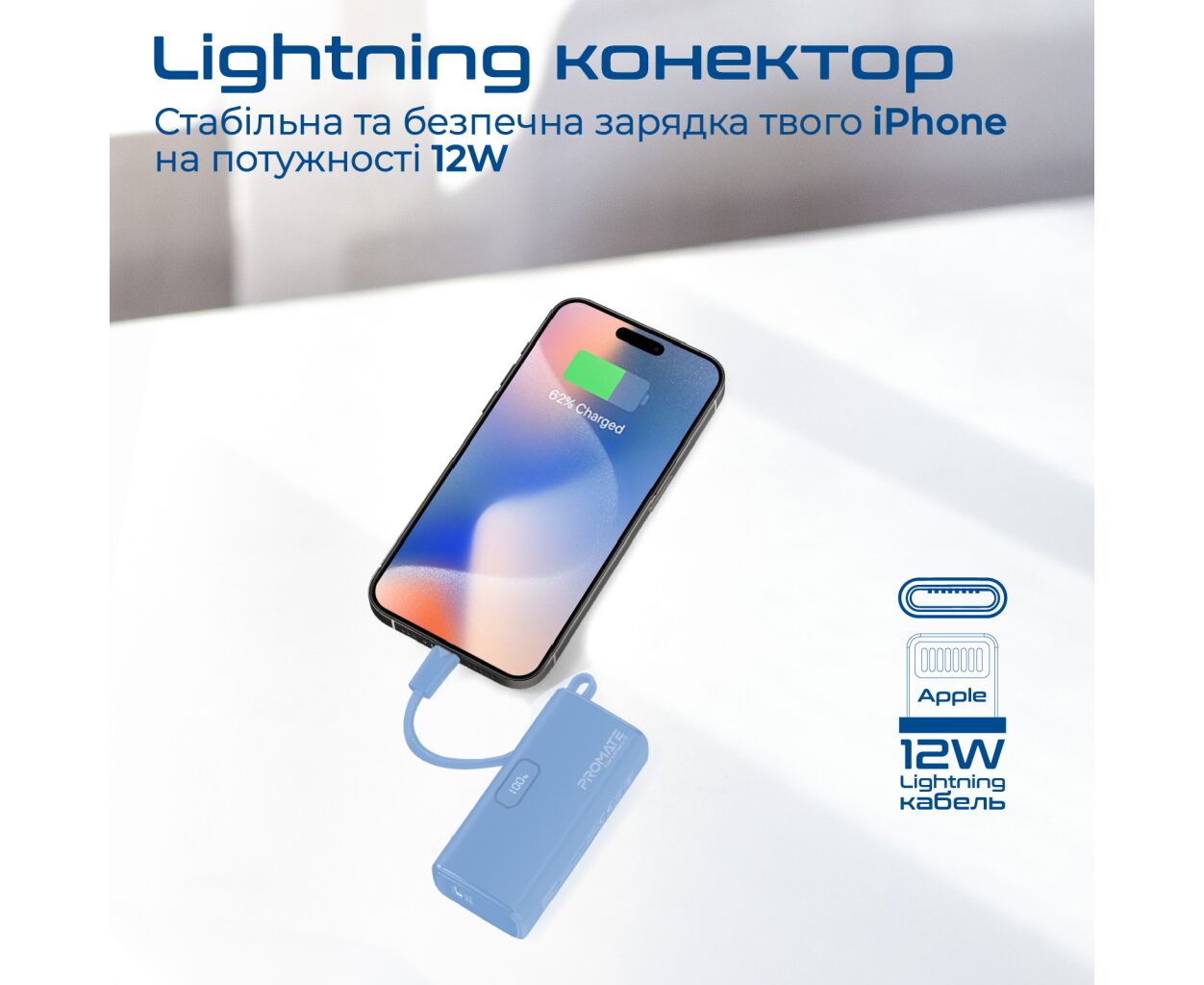 Ємність - 5000 mAh, електрохімічна система - Li-ion, Джерело заряду батареї - USB, інтерфейси підключення (вихід) - USB Type-C, Lightning, вихідний струм - 2.4 A, 2.22 A, 1.67 A, розмір - 78 х 37 х 25 мм, матеріал корпусу - пластик, вага - 106 г, Колір - блакитний