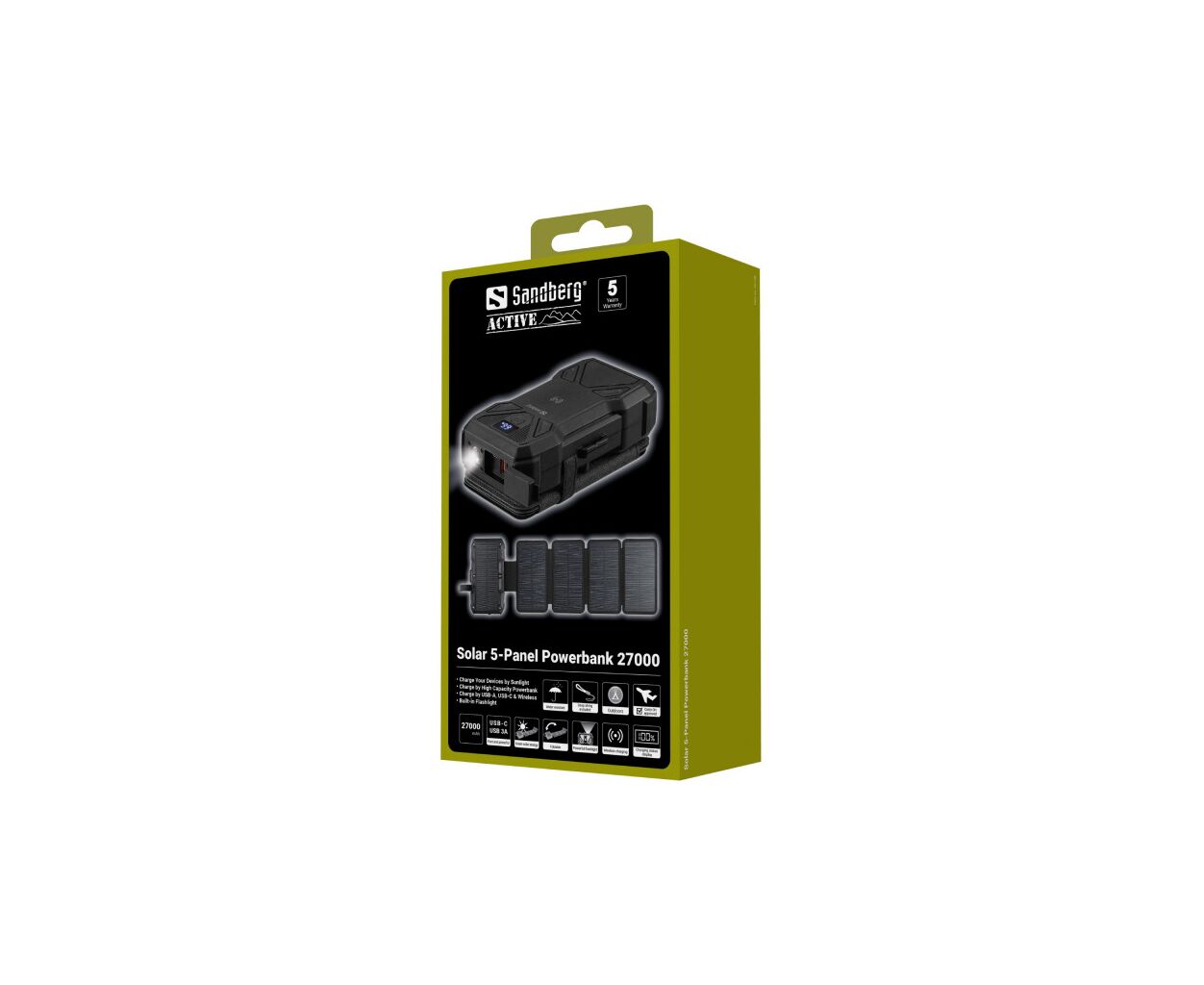 Опис Батарея універсальна Sandberg 27000mAh Solar 5-Panel 8W, PD/20W, IP54, Flashlight, wireless charging 15W (421-06)