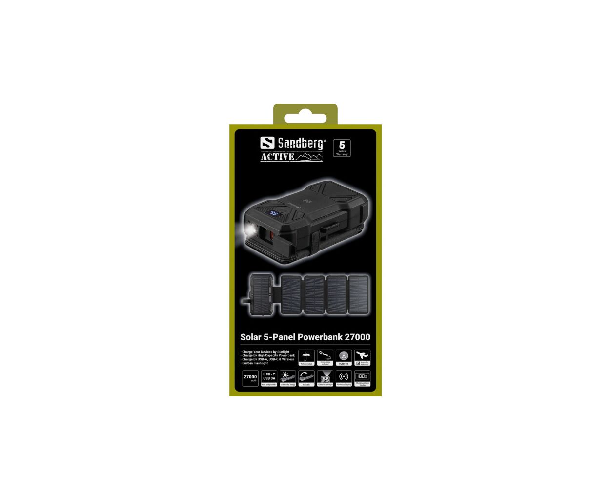 Батарея універсальна Sandberg 27000mAh Solar 5-Panel 8W, PD/20W, IP54, Flashlight, wireless charging 15W (421-06)