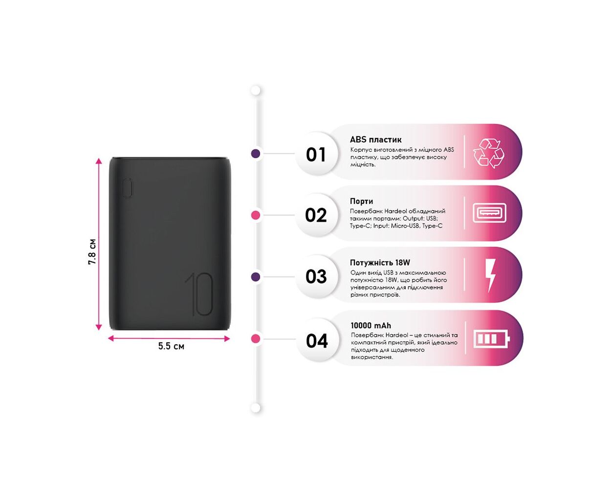 Характеристики Батарея універсальна TheGeneral 10000mah Hardeol, QC/3.0/18W (40012419-01)