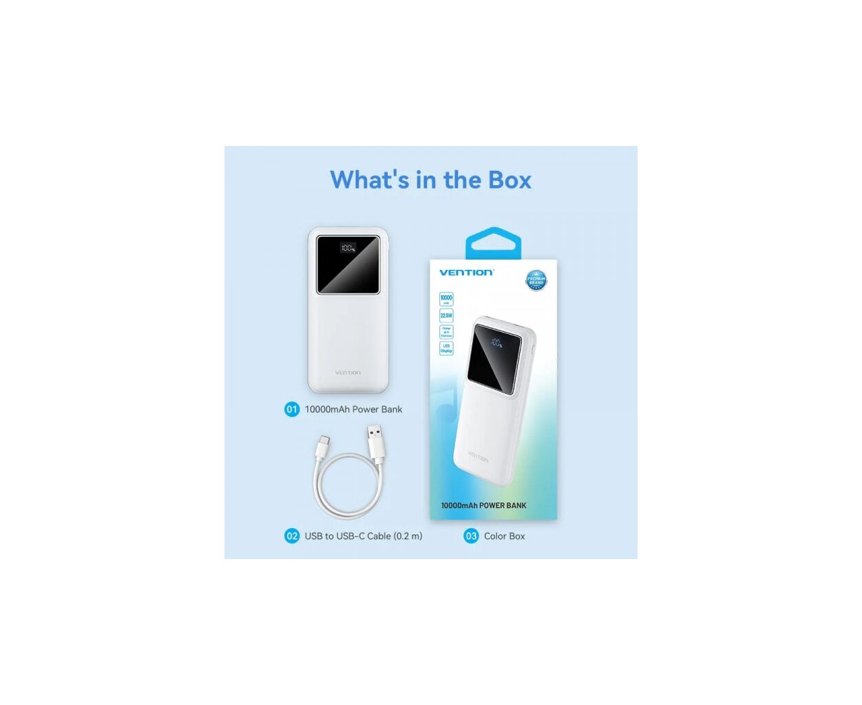 Батарея універсальна Vention 10000mAh 22.5W 3A PD, QC/3.0, LED Display, White (FHKW0)