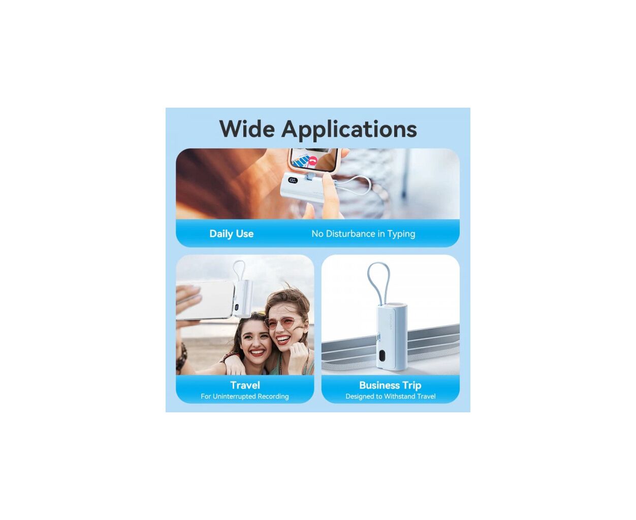 УМБ оснащена портом USB Type-С та двома кабелями – Lightning та USB Type-С. Вона підтримує одночасне заряджання декількох пристроїв.