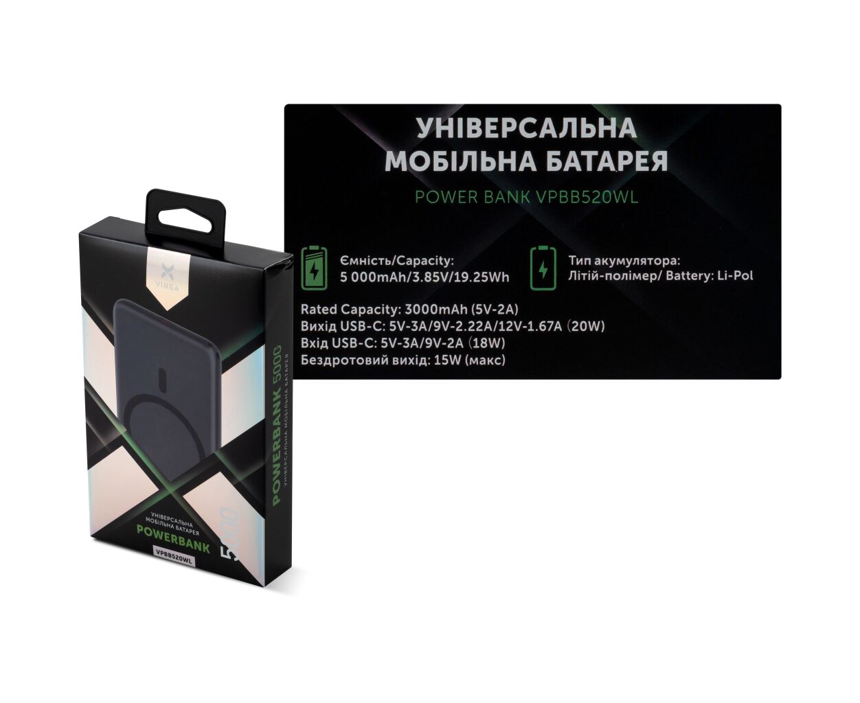 Батарея універсальна Vinga 5000 mAh 20W/15W Wireless (VPBB520WL)