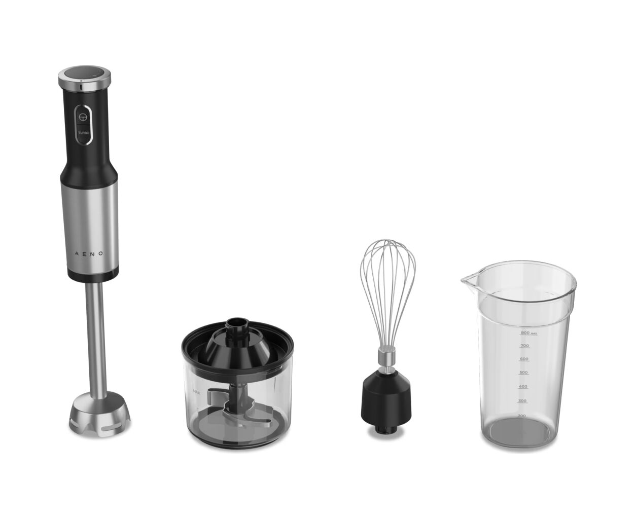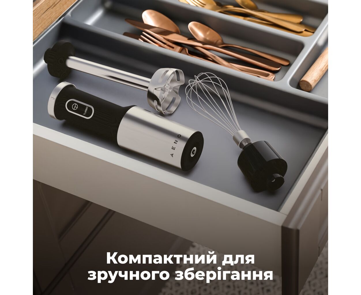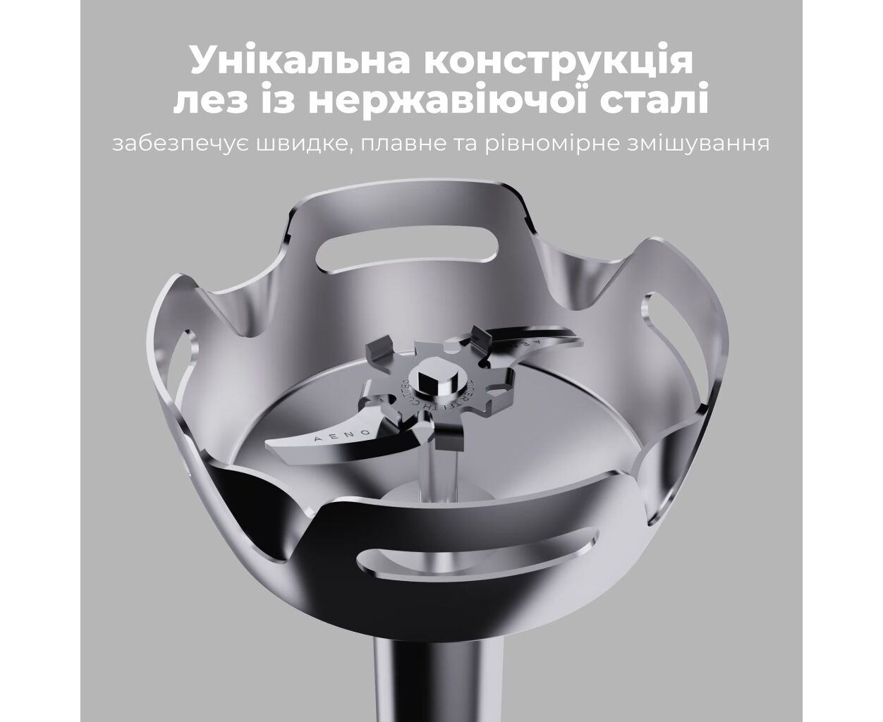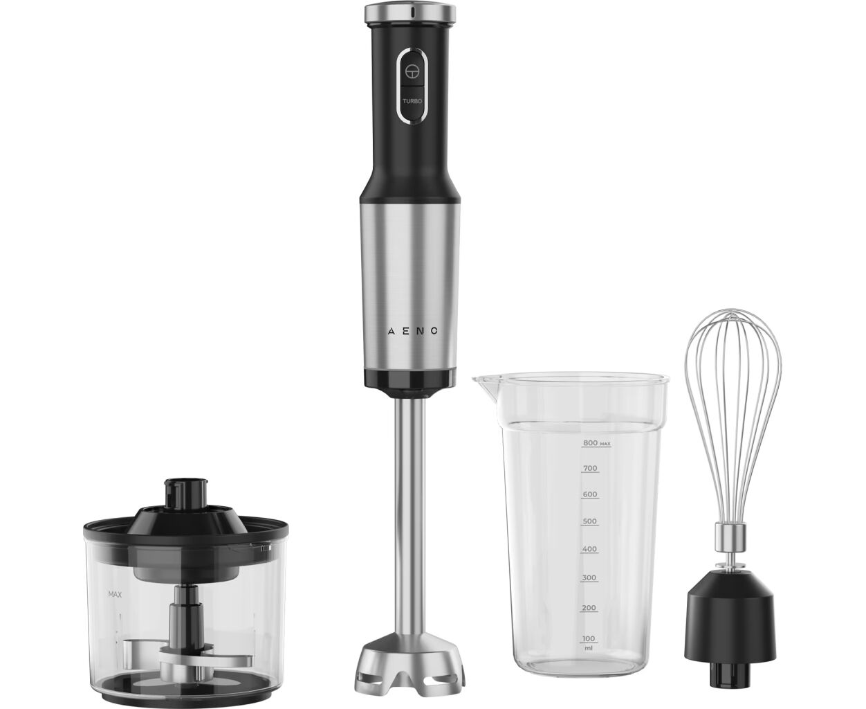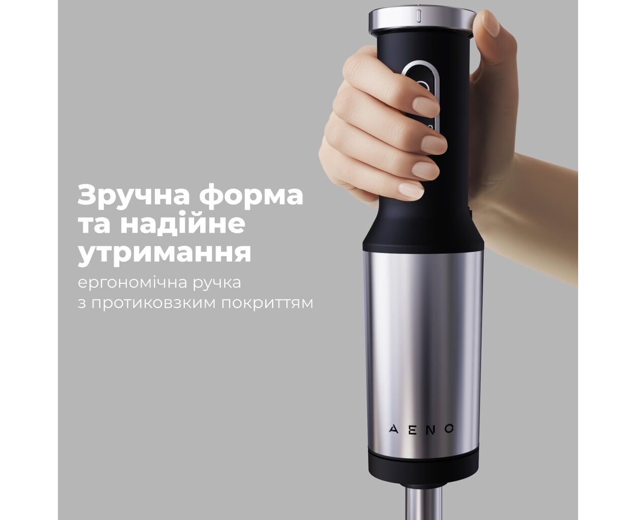 Універсальні можливості та зручність використанняБлендер AENO HB4B пропонує 25 швидкостей, що дозволяє точно підібрати оптимальний режим для кожного інгредієнта. Це робить його ідеальним для приготування різноманітних страв, від ніжних пюре до густих соусів. Занурювальна частина виготовлена з металу, що гарантує довговічність та стійкість до зношування. У комплекті з блендером йдуть віночок, мірна чаша об'ємом 0,8 літра та подрібнювач на 0,5 літра, що розширює можливості його використання.