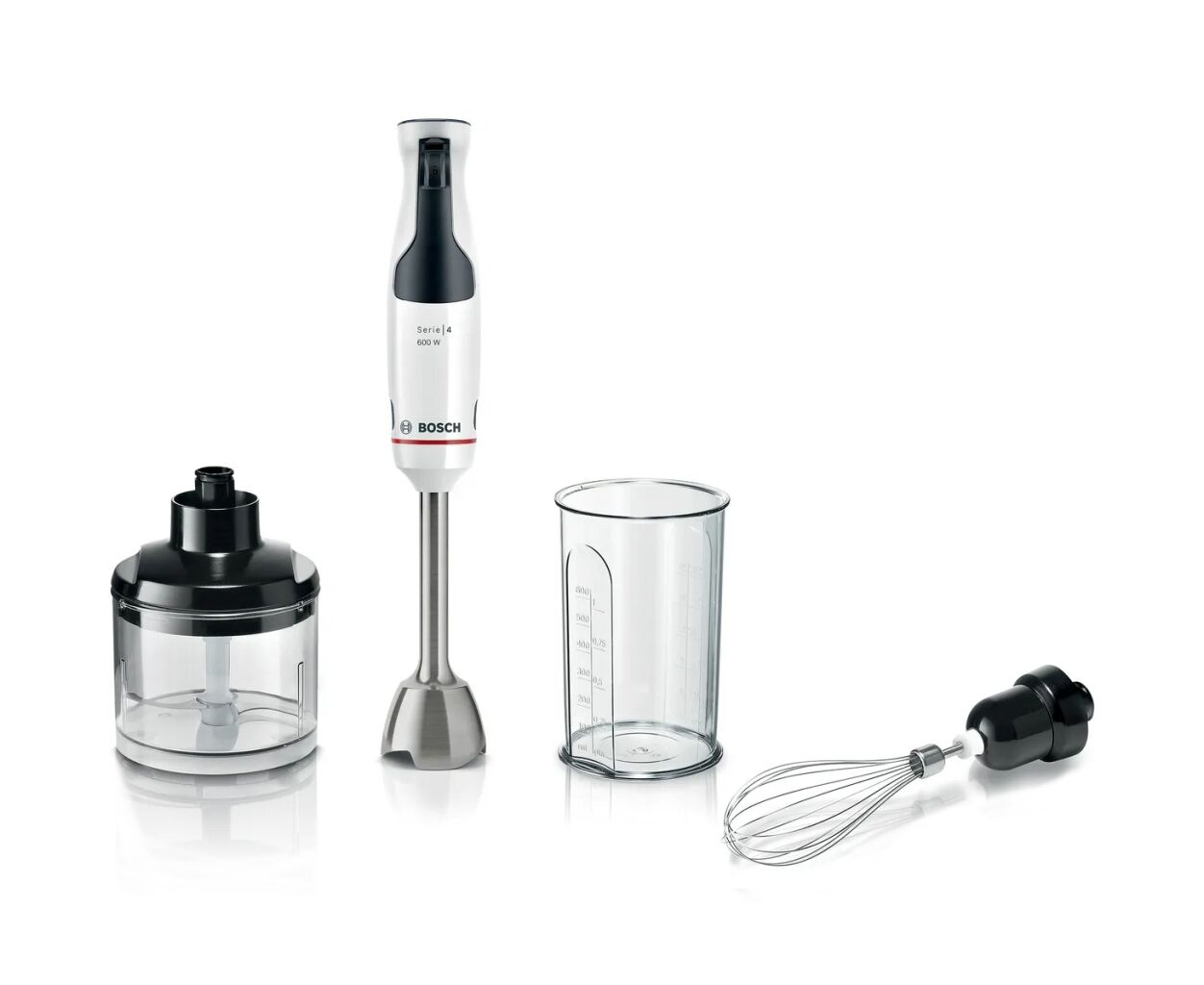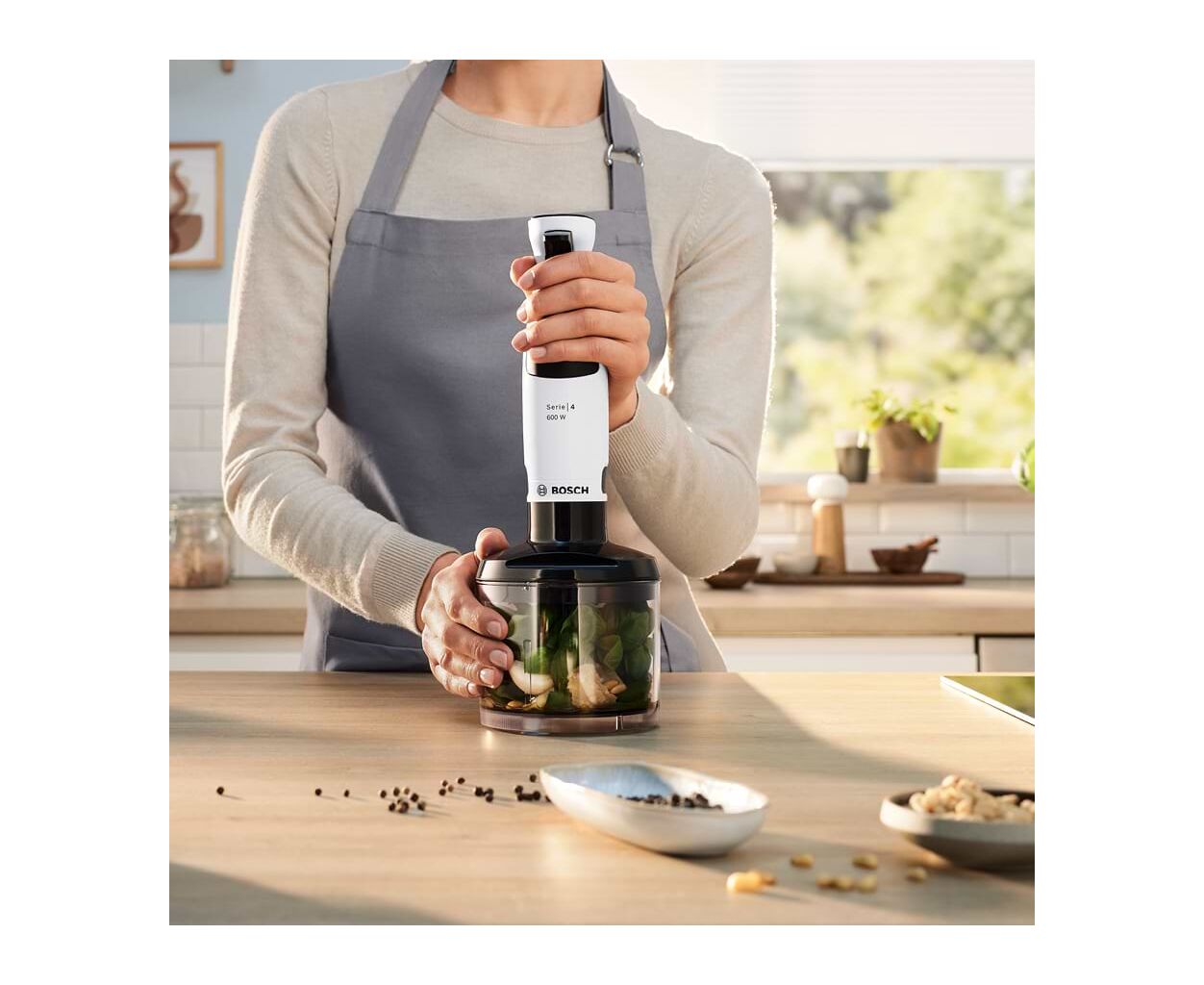 Bosch MSM4W221 підтримує концепцію змінюваності аксесуарів, дозволяючи легко адаптувати блендер під різні задачі. З легкістю знімайте насадку та встановлюйте іншу - наприклад, насадку-вінчик або міні-подрібнювач об'ємом 500 мл, що розширює діапазон можливостей від приготування соусів до збивання кремів.