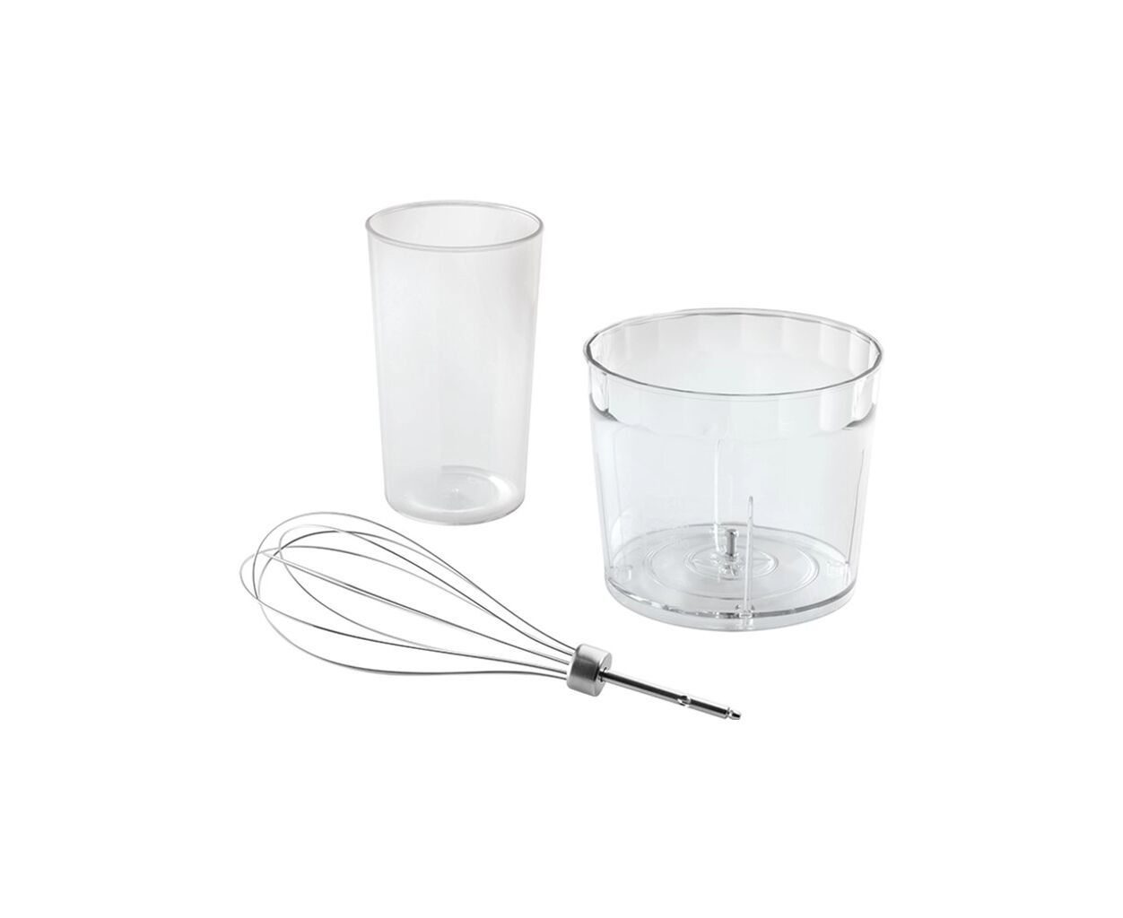 У комплекті ви знайдете чашу місткістю 1 л, яка забезпечить комфортне змішування великих обсягів інгредієнтів. Доступна ємність 500 мл для безпечної роботи в чаші захищає від небажаного розбризкування. Також є окремий міні-подрібнювач на 600 мл – ідеальний вибір для менших порцій та швидкого подрібнення. Додатково, насадка-вінчик дозволяє створювати пухкі креми та соуси без зусиль.
