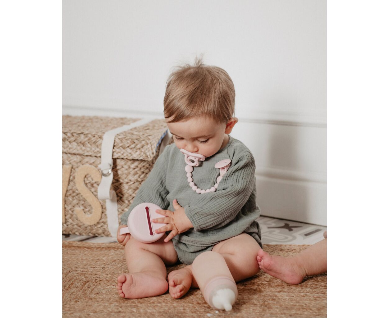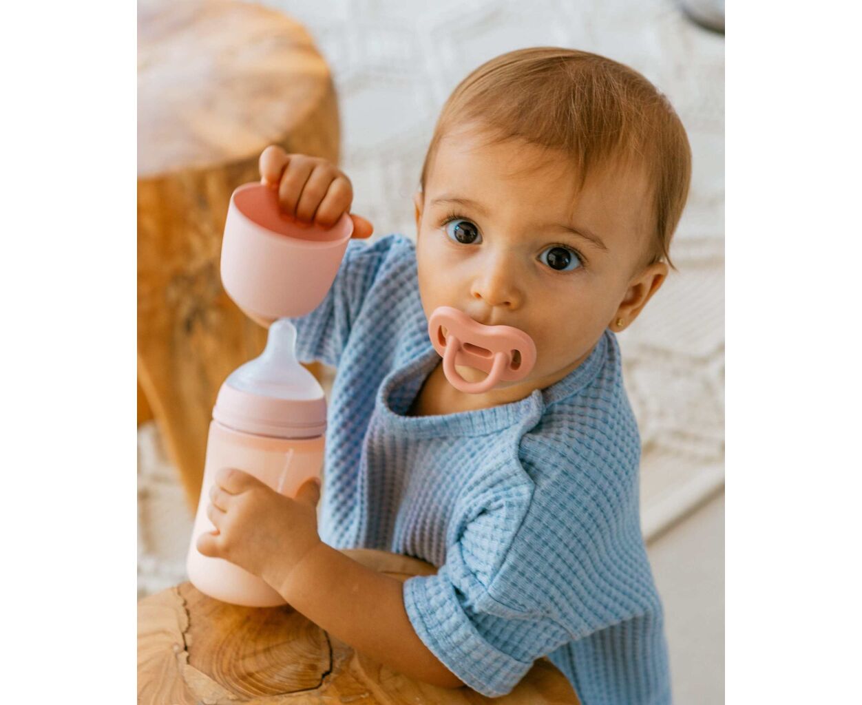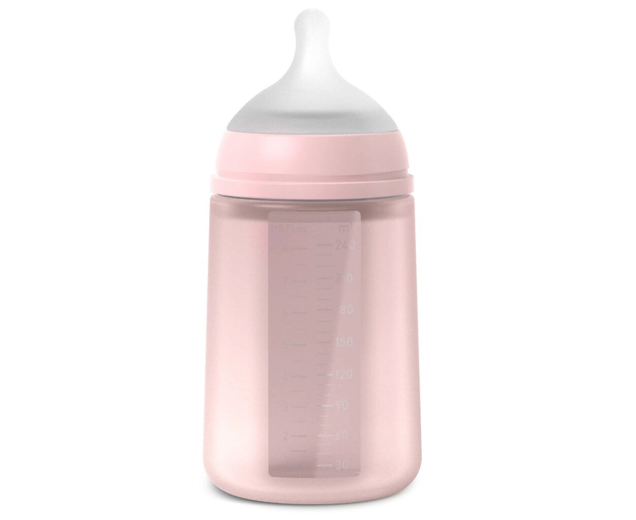 Опис Пляшечка для годування Suavinex Colour Essence, 240 мл, силіконова, 240 мл, фізіологічна соска повільний потік, , світло-рожева (308654)
