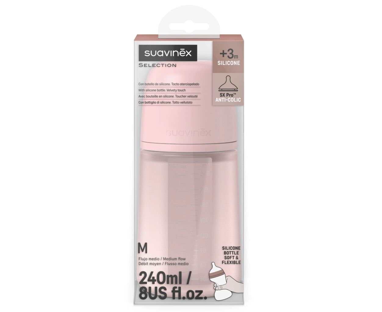 Пляшечка для годування Suavinex Colour Essence, 240 мл, силіконова, 240 мл, фізіологічна соска повільний потік, , світло-рожева (308654)
