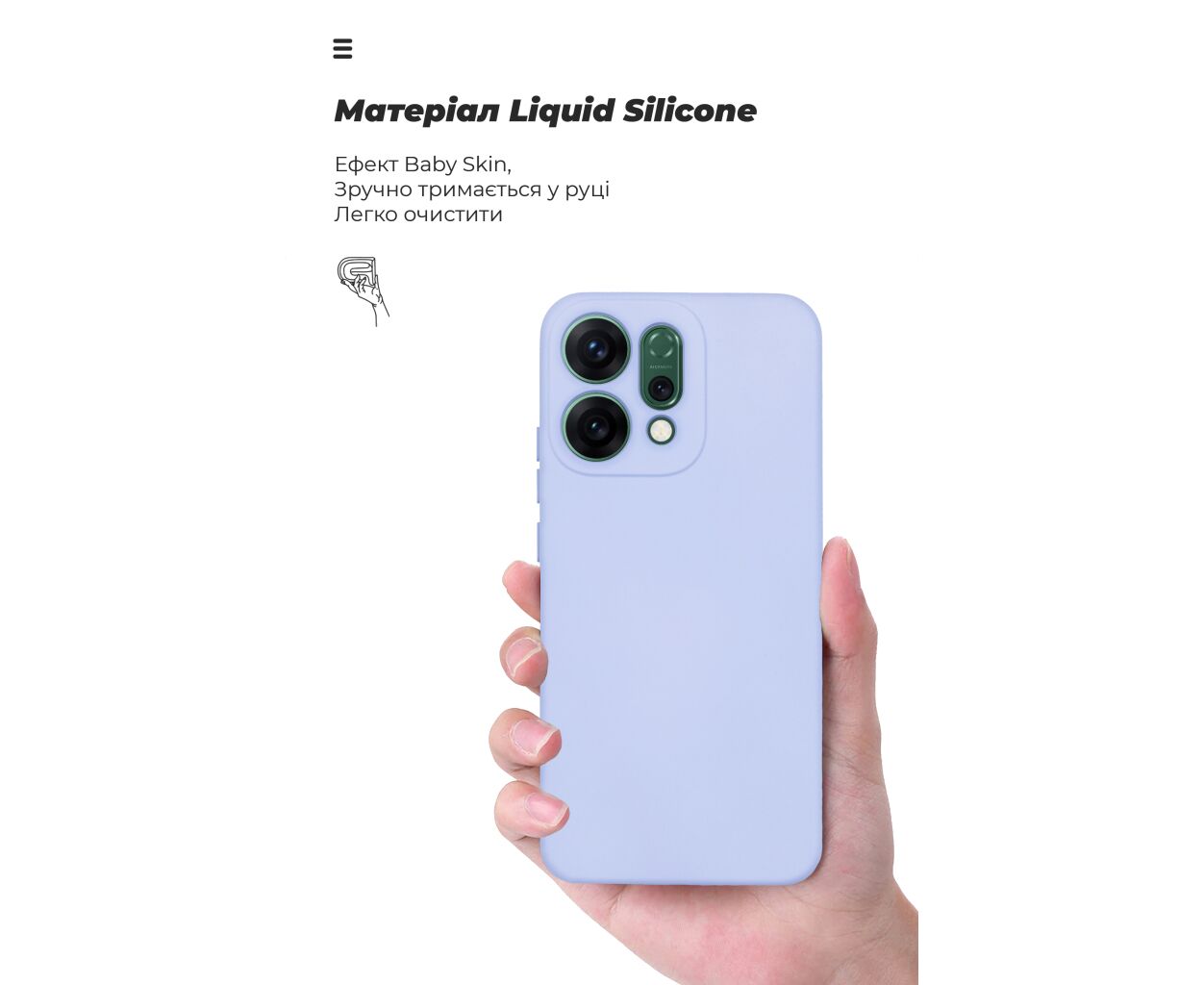 Накладка легко надівається на смартфон завдяки розтягувальним бортикам, які також додатково захищають, виступаючи над поверхнею дисплея й камери. В чохлі передбачені всі необхідні вирізи та кнопки. Він сумісний з усіма типами захисних стекол.