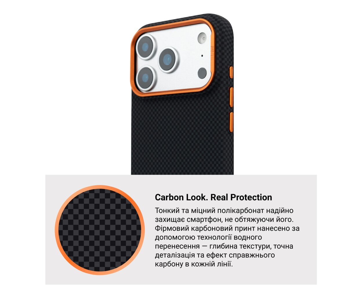 Опис Чохол до мобільного телефона Armorstandart LikeCarbon2 SE MagCase Apple iPhone 17 Pro Kevlar Black Orange (ARM89164)