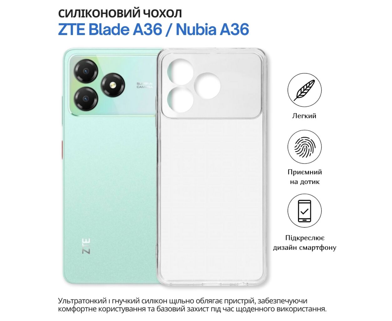 сумісність з моделями - ZTE Blade A36, Nubia A36, Тип чохла для телефону - накладка, Призначення - модельний, Матеріал - силікон, Колір - прозорий