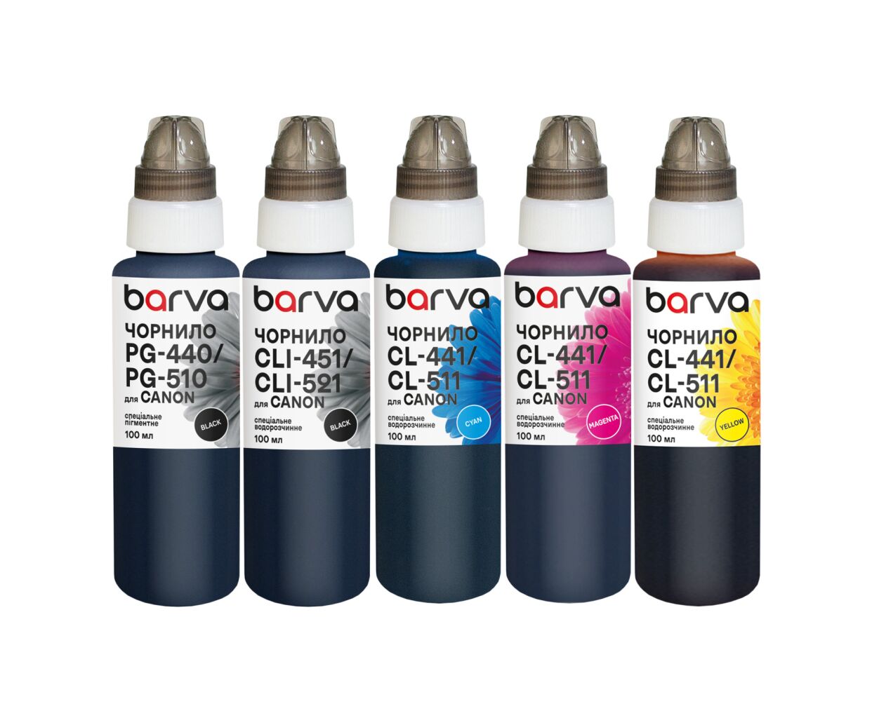 Тип - сумісний, тип чорнила - пігментні, водорозчинні, сумісність з пристроями бренду - Canon, Колір - набір (set), ємність - 5 х 100 мл