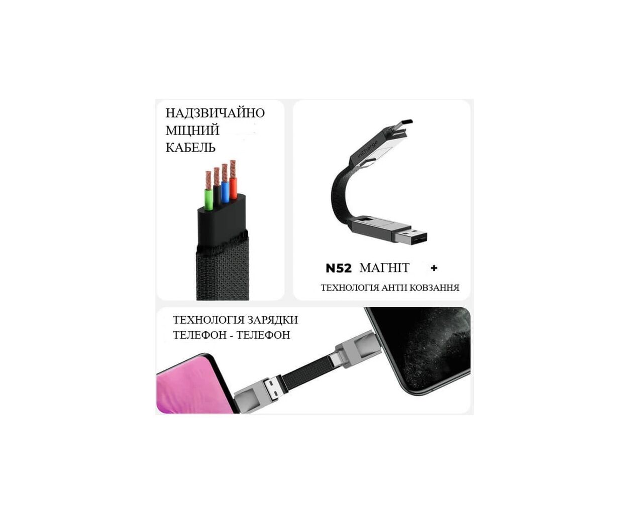 • 6 в 1 — підтримує всі популярні типи з’єднань: USB-A → USB-C; USB-A → MicroUSB; USB-A → Lightning; USB-C → USB-C; USB-C → MicroUSB; USB-C → Lightning