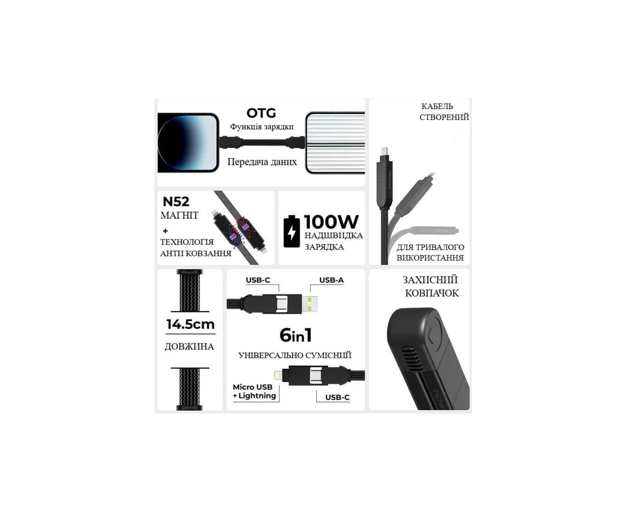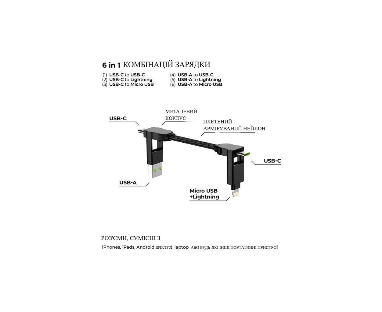 • 6 в 1 — підтримує всі популярні типи з’єднань: USB-A → USB-C; USB-A → MicroUSB; USB-A → Lightning; USB-C → USB-C; USB-C → MicroUSB; USB-C → Lightning