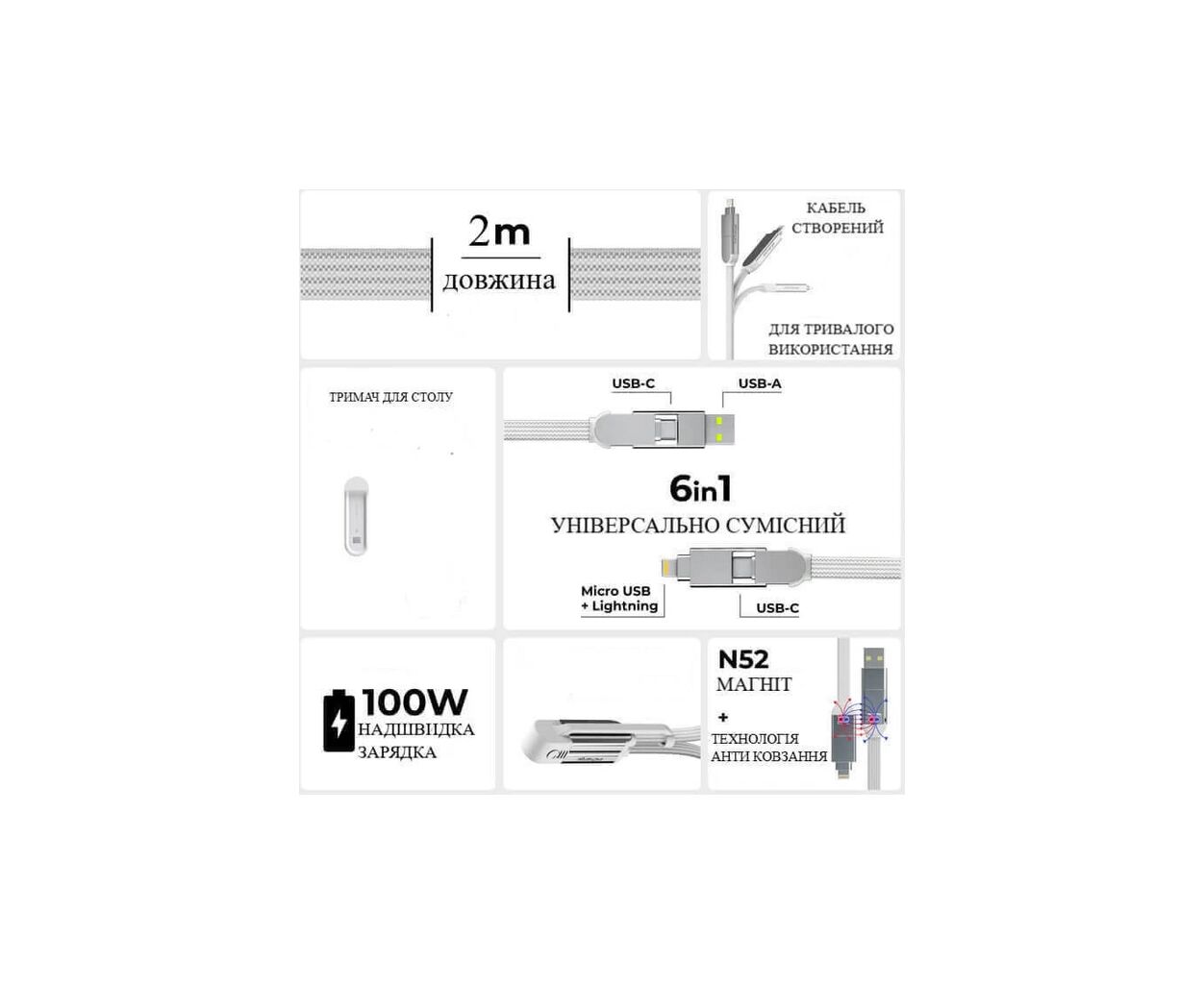 • 6 в 1 — підтримує всі популярні типи з’єднань: USB-A → USB-C; USB-A → Lightning; USB-A → Micro USB; USB-C → USB-C; USB-C → Lightning; USB-C → Micro USB