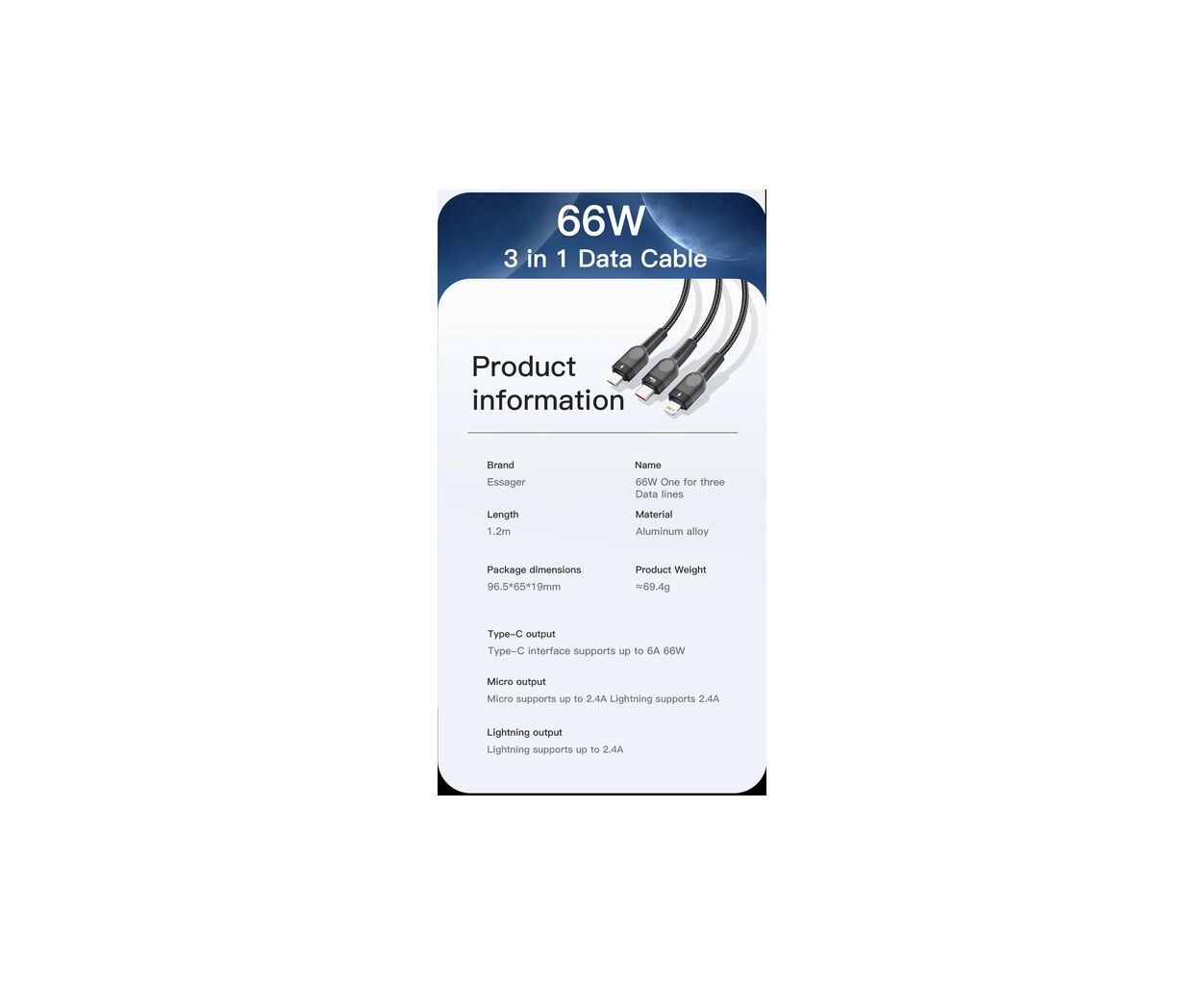 Опис Дата кабель USB 2.0 AM to Lightning + Micro 5P + Type-C 1.2m 66W black Essager (EXCMTL-XJ01)