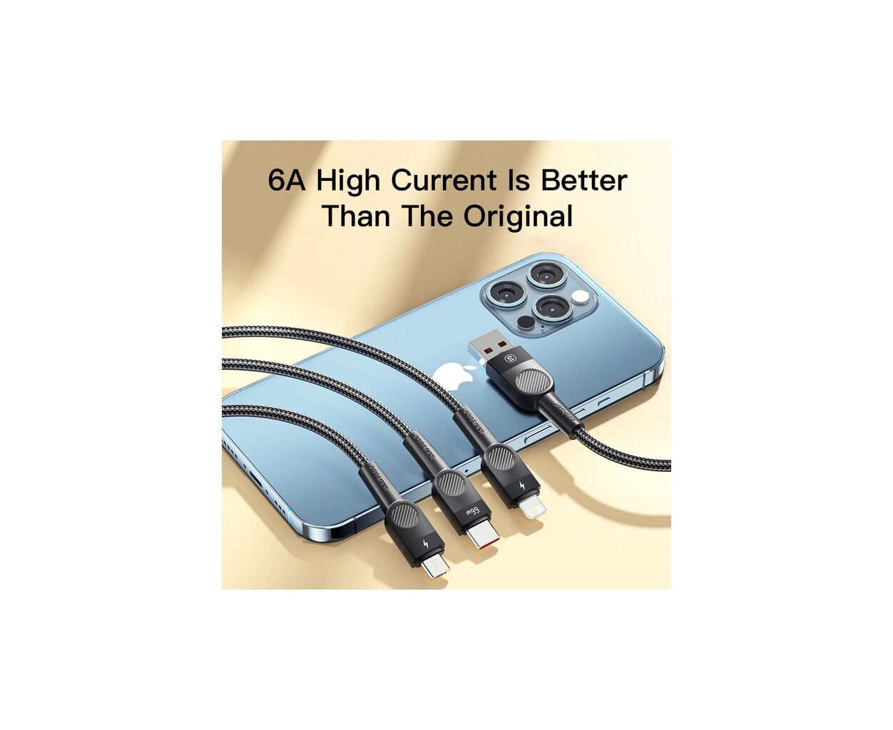 Тип - кабель, Тип конектора 1 - USB, Тип конектора 2 - micro USB, Lightning, USB Type-C, довжина - 1.2 м, тканинне обплетення, 66 W, Порт Type-C: 6A (max) Порт micro-USB: 2.4A (max) Порт Lightning: 2.4A (max), Колір - чорний