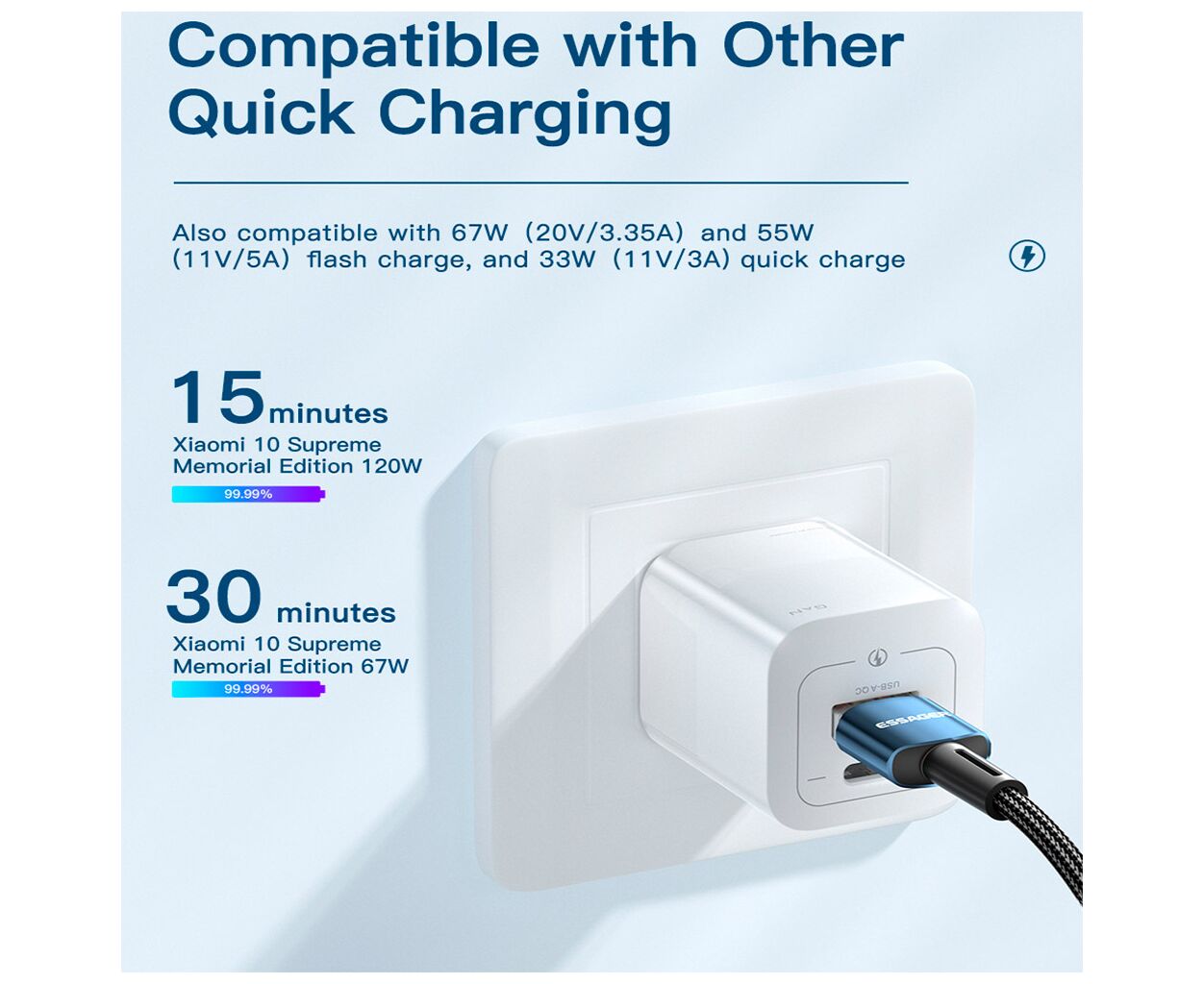 - Підтримує швидку зарядку потужністю 120 Вт для смартфонів Xiaomi, Redmi та Black Shark;