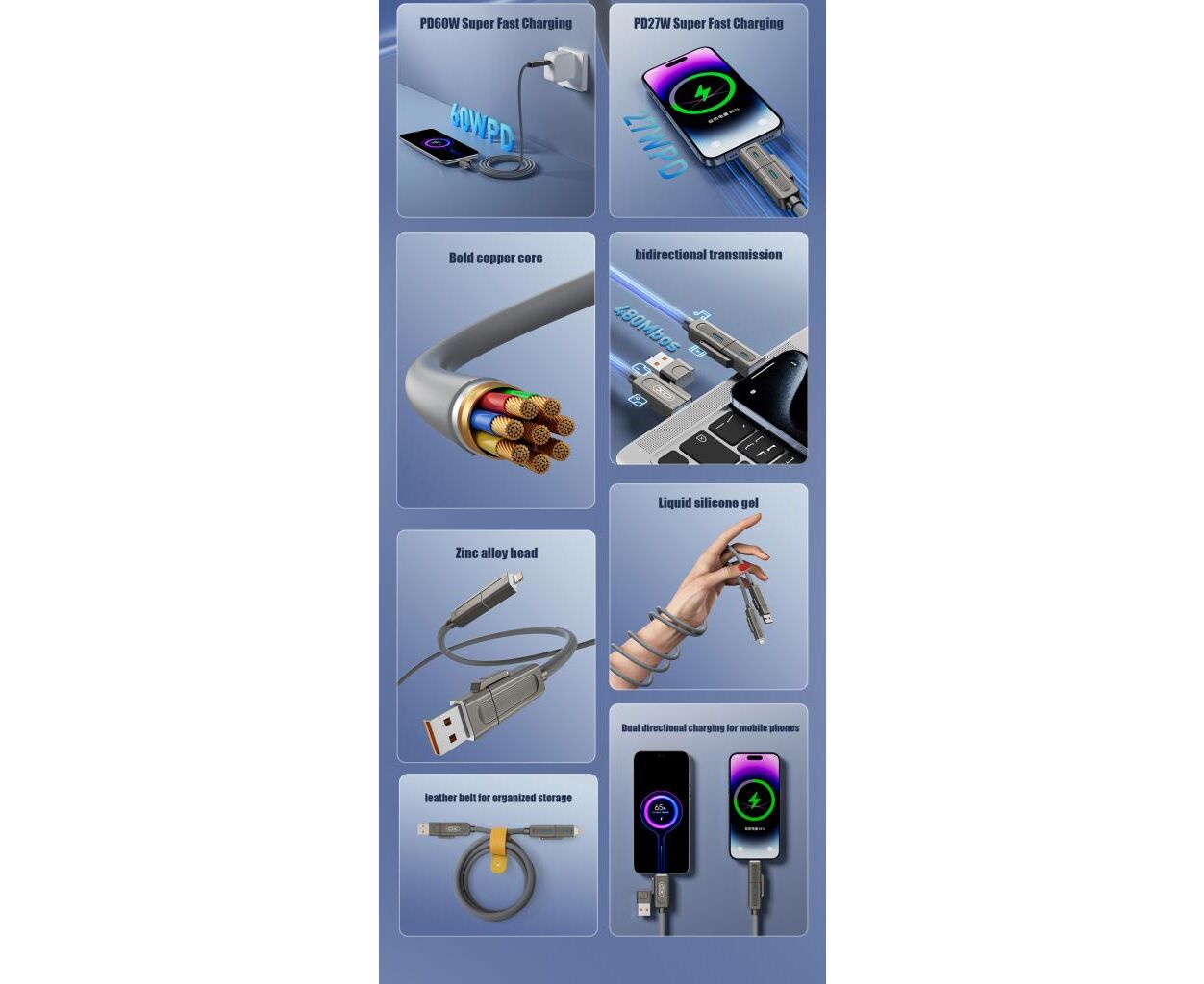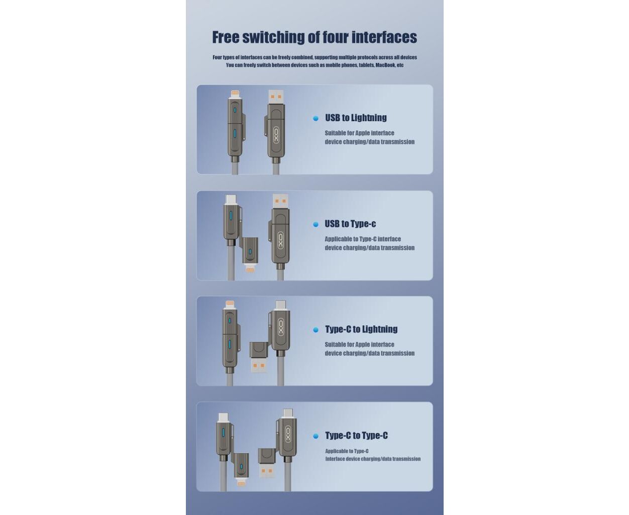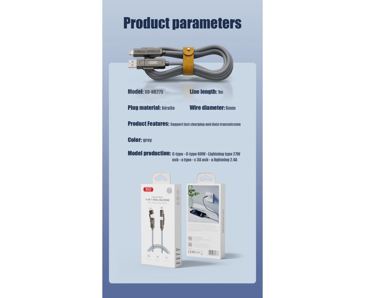 Опис Дата кабель USB 2.0 AM to USB-C + USB 2.0 AM to Lightning 1.0m 60W gray XO (NB275_4-in-1_Gray)