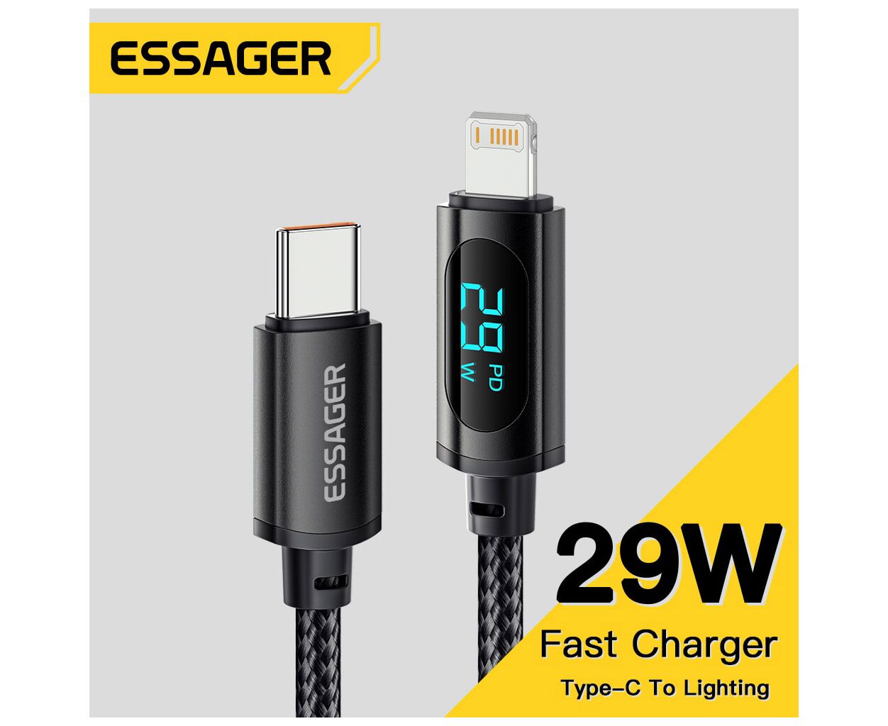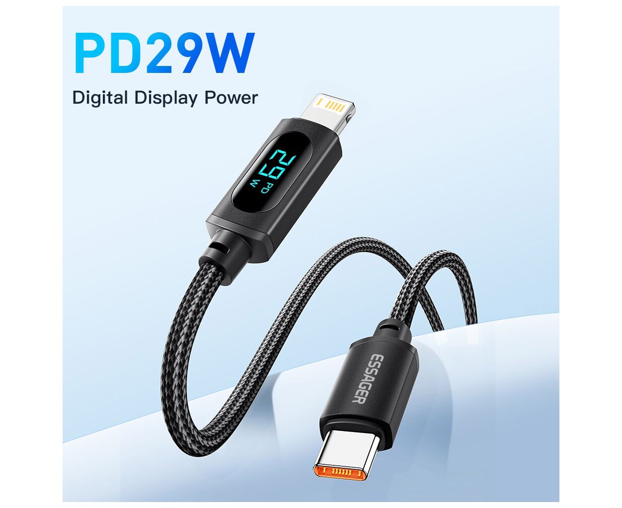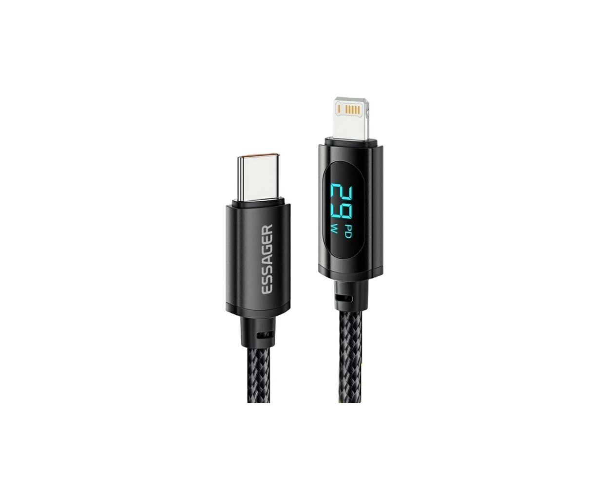 Фотографії, фільми чи документи – вам не доведеться нескінченно чекати, поки вони опиняться в пункті призначення. Світлодіодний екран. Екран цифрового дисплея показує поточну вихідну потужність під час заряджання пристрою в режимі реального часу. Він не тільки дозволяє вам бачити робочий стан системи заряджання, але також дозволяє вимірювати ефективність зарядного пристрою та акумуляторів. Високоякісний кабель Essager ідеально сумісний із будь-яким пристроєм з роз'ємом Lightning.