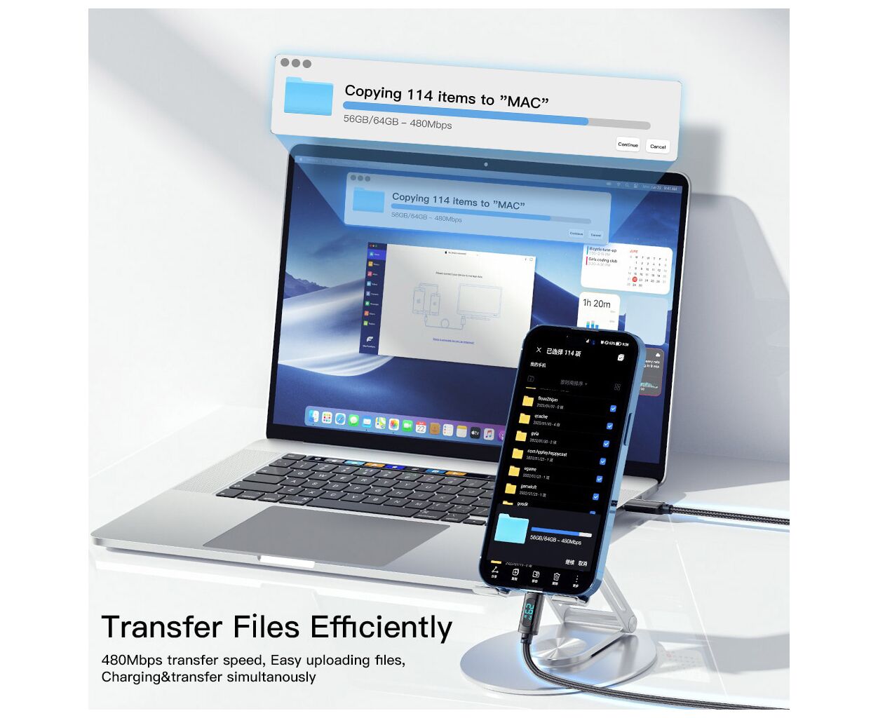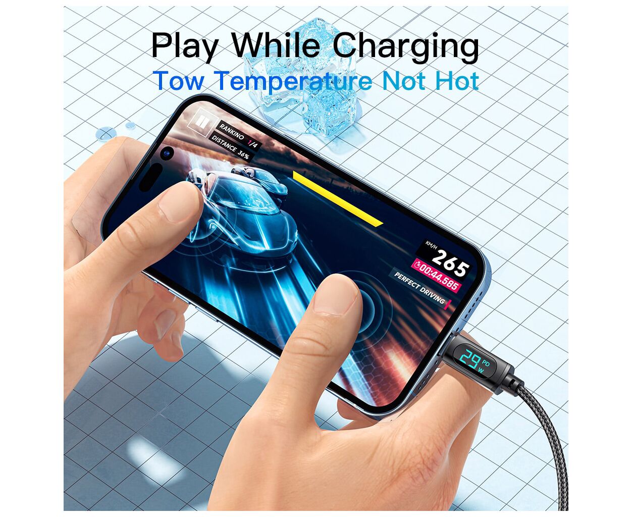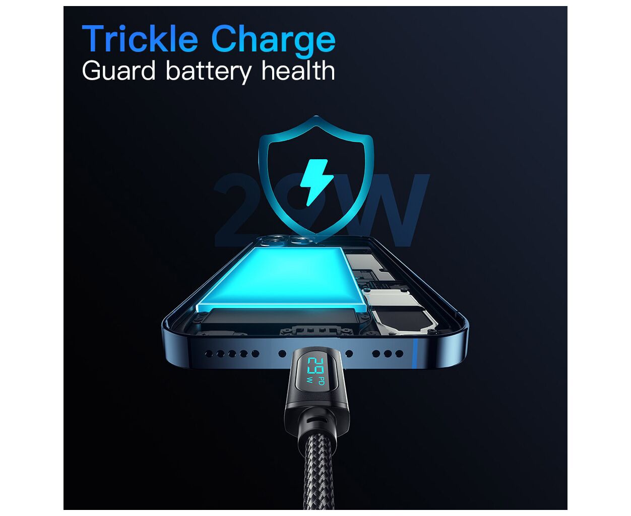 Фотографії, фільми чи документи – вам не доведеться нескінченно чекати, поки вони опиняться в пункті призначення. Світлодіодний екран. Екран цифрового дисплея показує поточну вихідну потужність під час заряджання пристрою в режимі реального часу. Він не тільки дозволяє вам бачити робочий стан системи заряджання, але також дозволяє вимірювати ефективність зарядного пристрою та акумуляторів. Високоякісний кабель Essager ідеально сумісний із будь-яким пристроєм з роз'ємом Lightning.