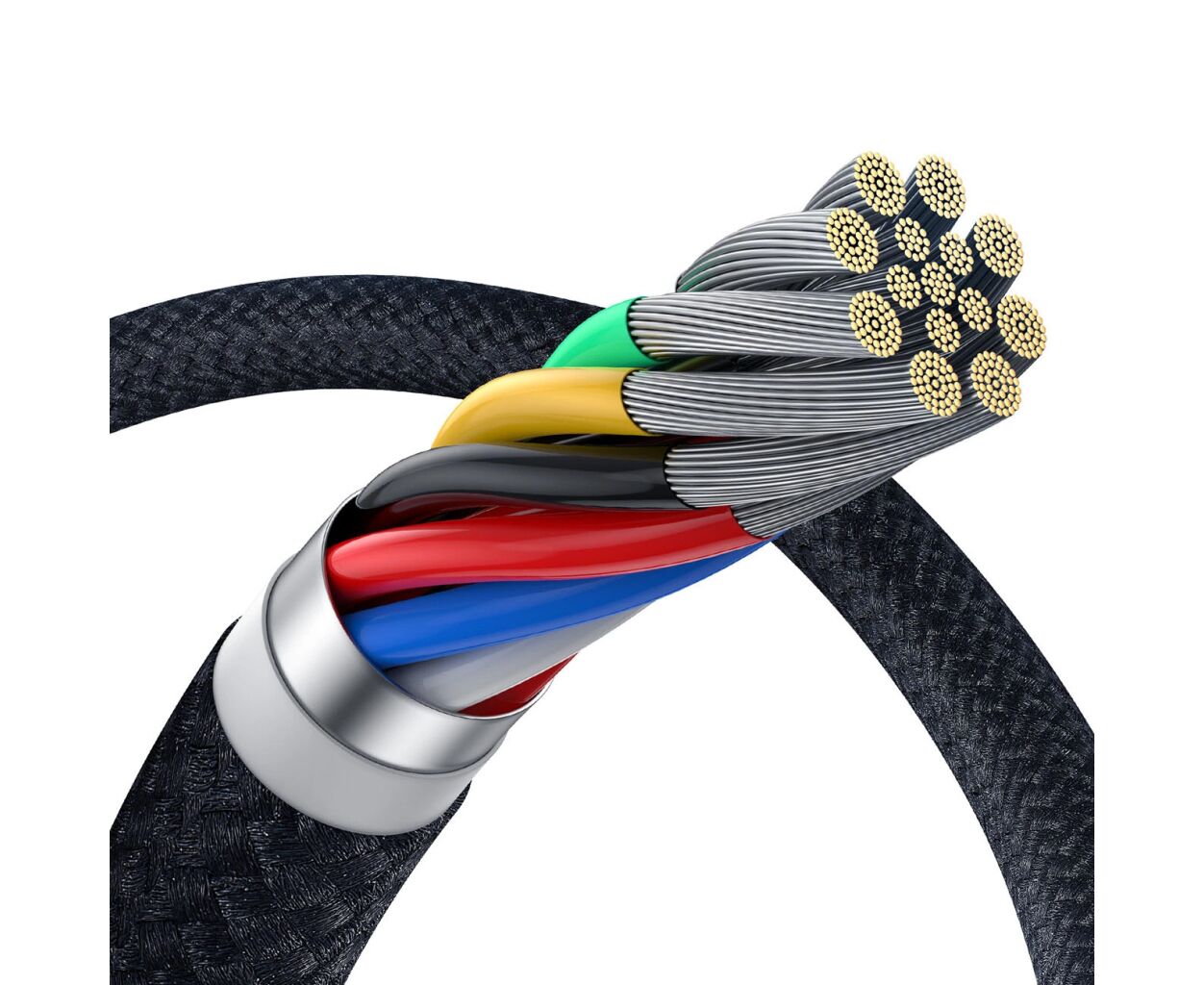 - Міцний та стильний дизайн. Елегантний корпус з плетеною нейлоновою обмоткою не тільки має чудовий вигляд, а й захищає кабель від зносу та пошкоджень, роблячи його довговічним.