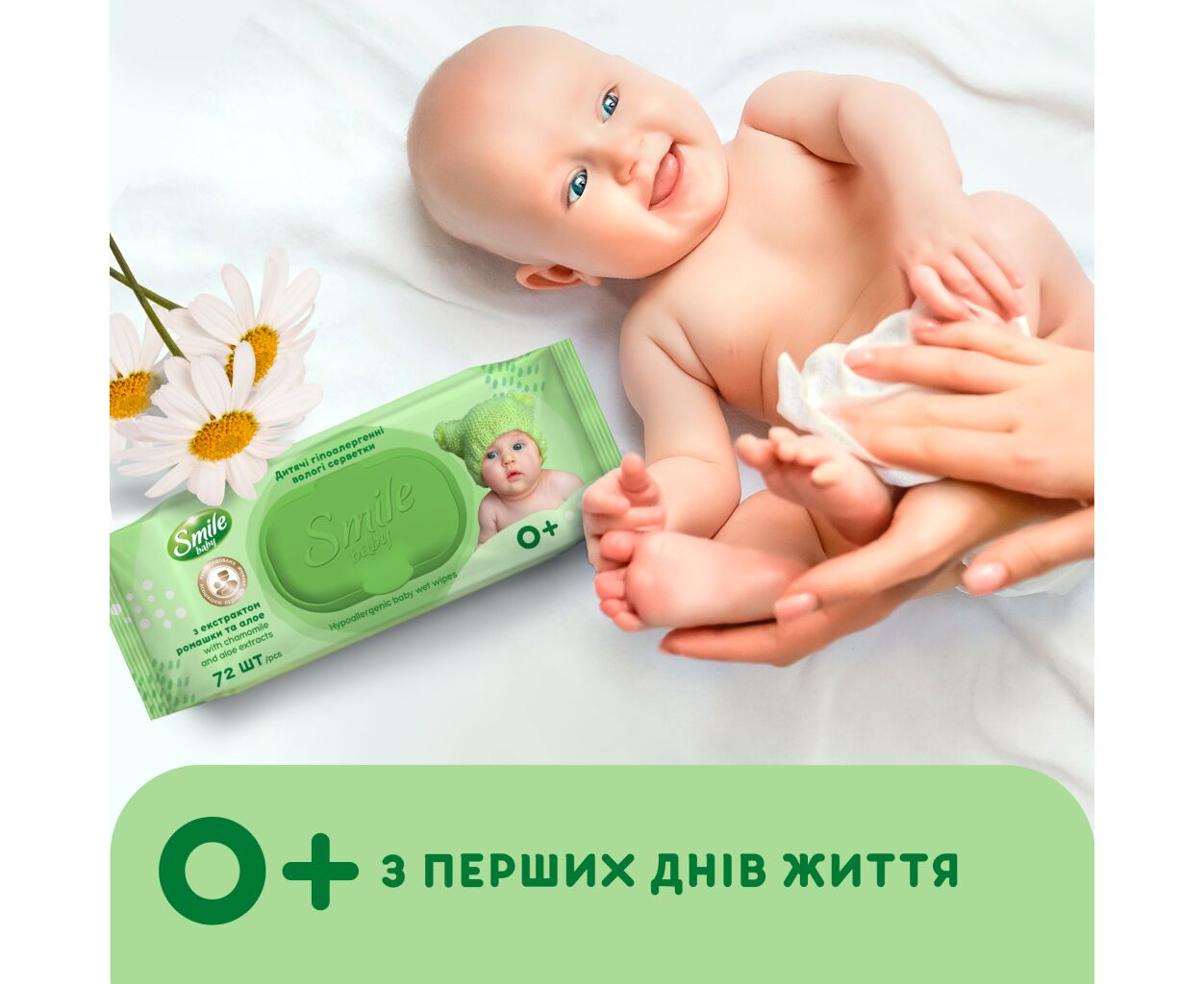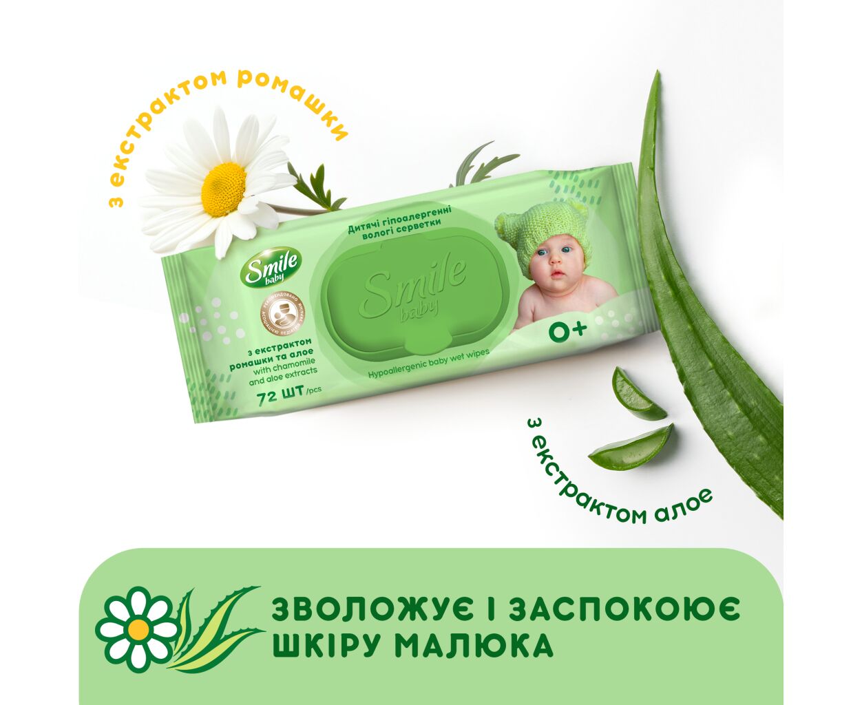 Кожна мама знає, наскільки незамінні вологі серветки, коли в будинку є дитина. Саме тому торгова марка Smile розробила варіант дитячих вологих серветок із екстрактом ромашки та соком алое. Ці ультрам'які вироби абсолютно безпечні для ніжної шкіри малюка завдяки своєму гіпоалергенному складу. Ромашка має антибактеріальні властивості і відмінно дезінфікує, а сік алое заспокоює чутливу шкіру дитини. Вітамін Е пом'якшує шкіру і загоює ранки, вітамін F усуває сухість і лущення шкіри. Серветки не містять у своєму складі спирту та надійно захищені якісною упаковкою. Для зручності батьків упаковка має спеціальний клапан, який дозволяє легко дістати серветку при необхідності.